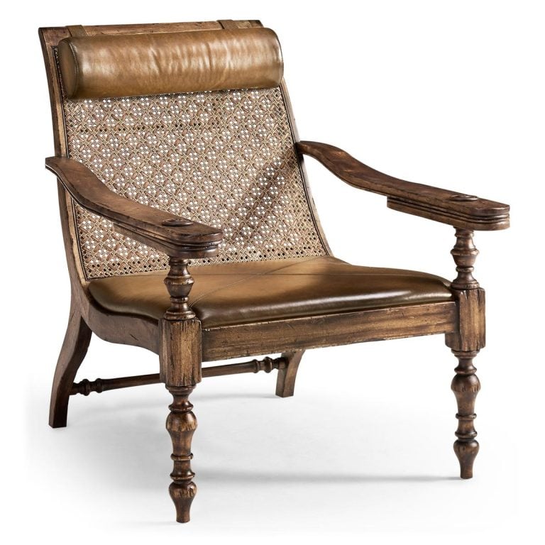 Product Description: Jonathan Charles 491332-C012 Palm Court Balmond Planter's Chair - The Palm Court Balmond Planter’s Chair pays homage to British Colonial design. Crafted from richly grained wood, it features turned legs and sculpted arms that curve into extended rests, a signature of the traditional planter’s chair. A caned back shows meticulous handwoven artistry, balanced by a soft leather seat and headrest. Brass inlaid drink rests and leather wrapped details highlight artisanal construction, blending heritage character with timeless sophistication.