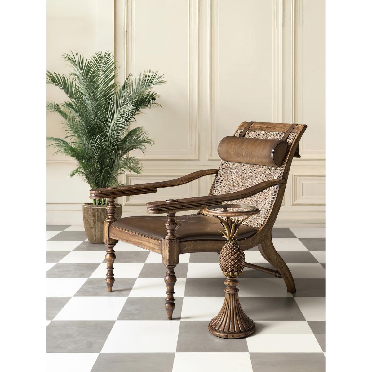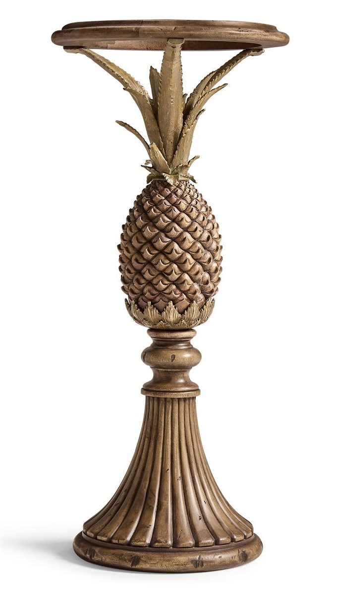 Product Description: Jonathan Charles 491343-PCA Palm Court Pineapple Martini Table - The Palm Court Pineapple Martini Table exudes tropical charm and sophisticated whimsy. The carved pineapple base, a traditional symbol of hospitality, is paired with a clear glass top supported by metal leaves. Finished in warm antique tones, this accent piece brings a touch of playful luxury to any room.
