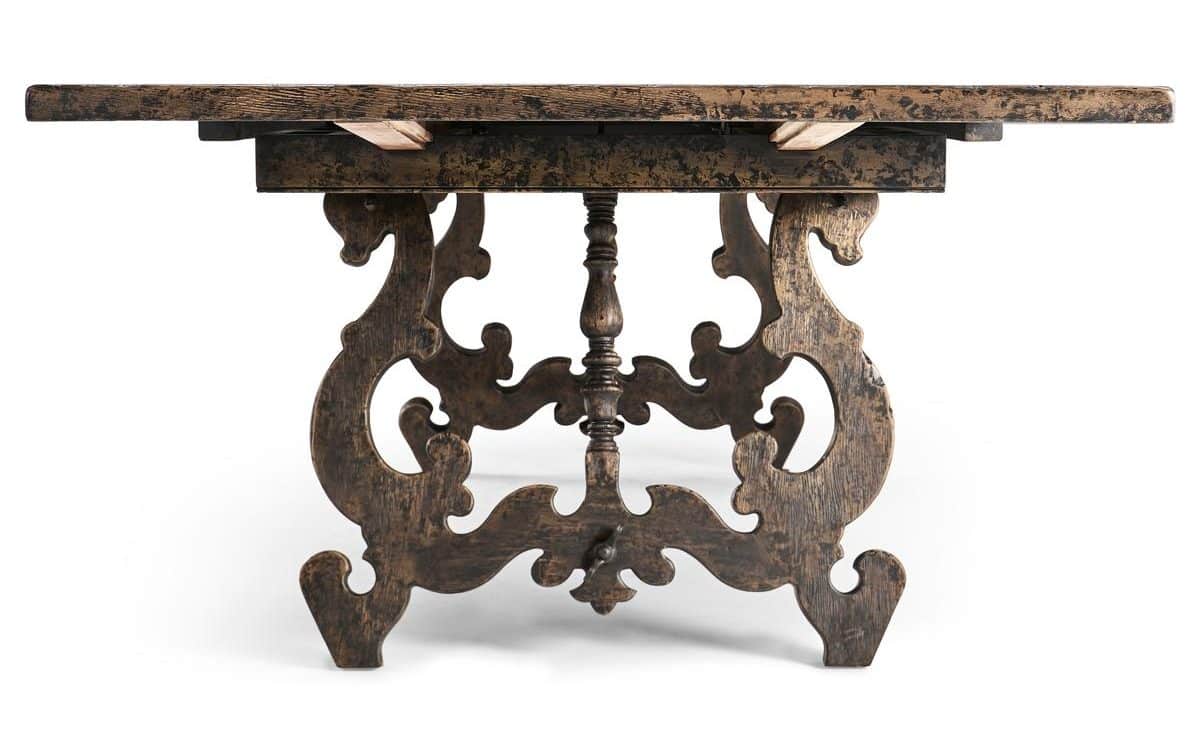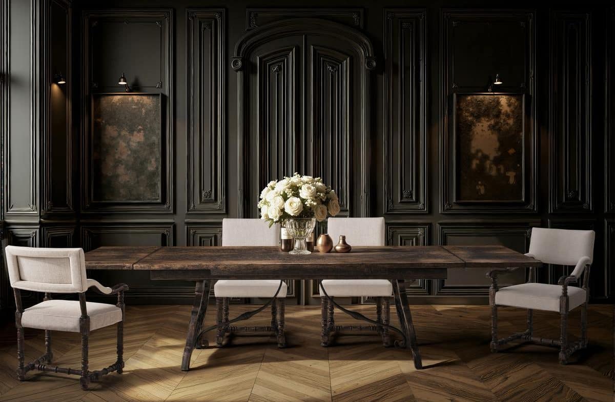 Product Description: Jonathan Charles 491348-BCL-86L Caldera Rectangular Dining Table 86" - The Caldera Dark Dining Table balances sculptural presence with artisanal character, showcasing the depth and texture of Black Caldera Oak. The finish reveals the natural grain of the wood, creating a layered patina that feels timeworn and sophisticated. Boldly carved pedestal bases, joined by wrought iron stretchers, lend architectural weight and visual movement. Grounded yet elegant, the Caldera brings European heritage and modern refinement to the dining space.