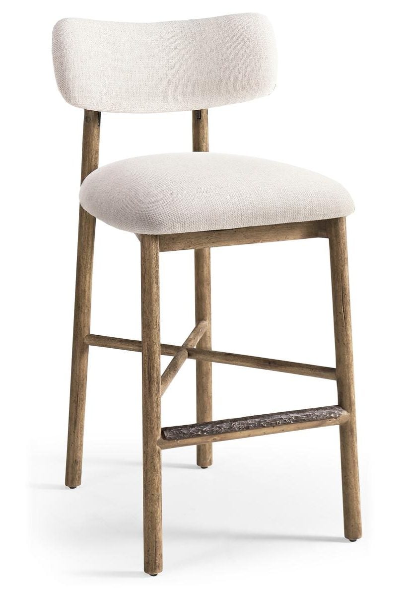 Product Description: Jonathan Charles 491349-TLA-BS-F075 Stone Ridge Upholstered Bar Stool - The Stone Ridge Upholstered Bar Stool blends transitional warmth with subtle industrial detail. Crafted from solid acacia wood in the Tully Light Acacia finish, its clean lines are highlighted by exposed stainless-steel joinery. The curved upholstered back and softly padded seat offer comfortable support without adding visual weight, while a protective metal accent band reinforces the footrest and adds a refined material contrast. Balanced and versatile, the stool brings sculptural ease to kitchen and bar settings.