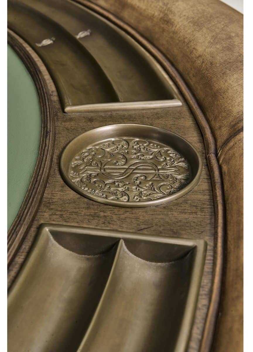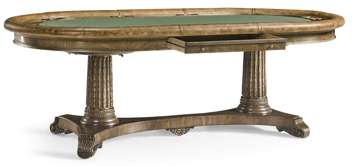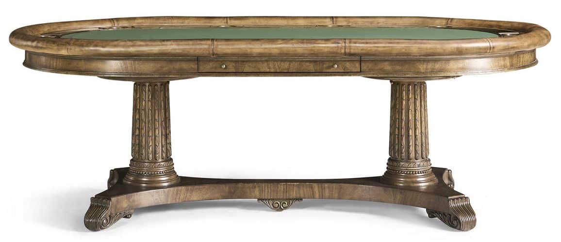 Product Description: Jonathan Charles 493199-MBL Light Mahogany Poker Table - Crotch mahogany, professional style oval poker table with an antique green leather top, leather tooling with four currencies, hand crafted brass cup holders and chip racks, and a drawer for storing poker chips for each player.