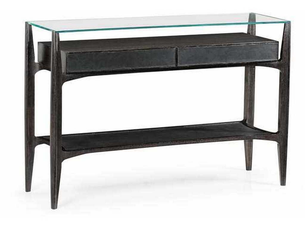Product Description: Jonathan Charles 495430-MAO JC Casual Architects Credenza with Glass Top - A substantial, oak-framed console table with a clear glass top and an under-tier featuring two drawers in leather. Inspired by classical Danish mid-century furniture.