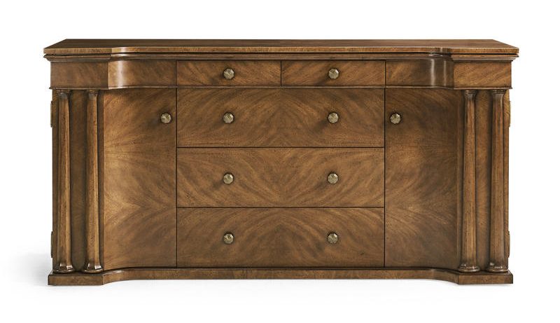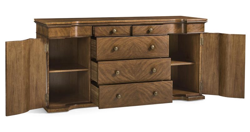 Product Description: Jonathan Charles 496207-CWM Hattie Sideboard - Made from beautiful Cerajera veneers, it showcases a warm, natural finish that brings elegance to your space. Designed with five drawers and two side cabinets, it offers plenty of room for dining essentials. The cabinets include an adjustable shelf, allowing you to organize items to fit your needs while maintaining a stylish appearance.