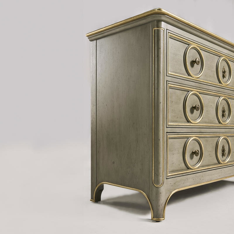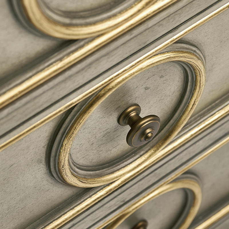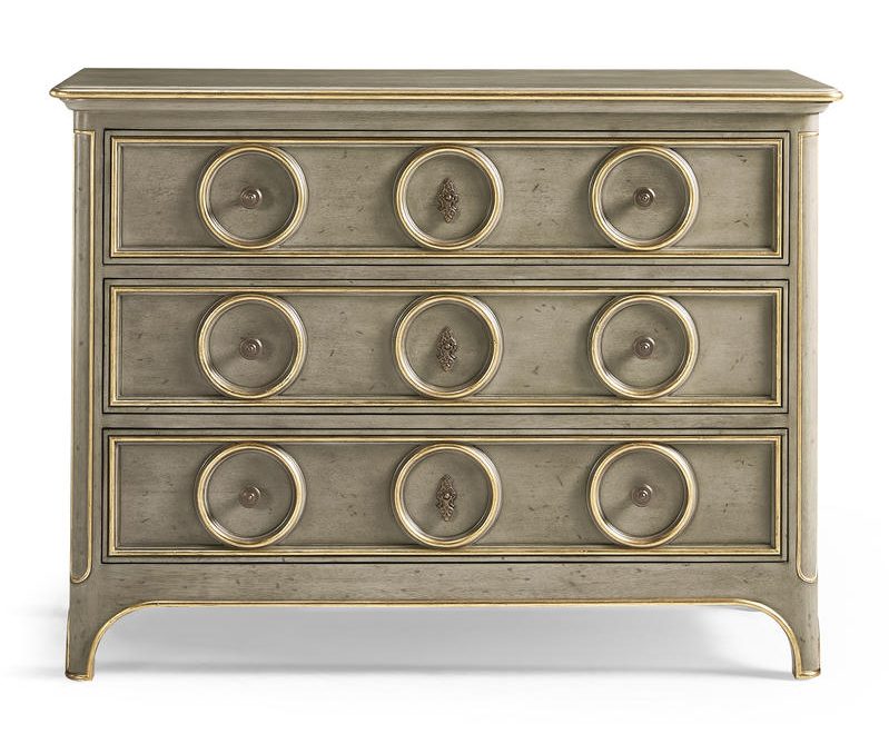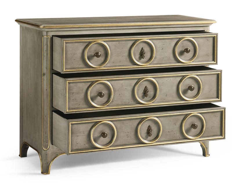 Product Description: Jonathan Charles 496213-PBG Buckingham Accent Dresser - Buckingham Accent Chest is a stunning piece that exudes timeless elegance. Finished in a sophisticated Buckingham Grey, this dresser is designed to complement both classic and contemporary interiors. Each drawer is adorned with delicate gold leaf detailing, which also embellishes the dresser's top edge, adding a touch of luxury and refinement.