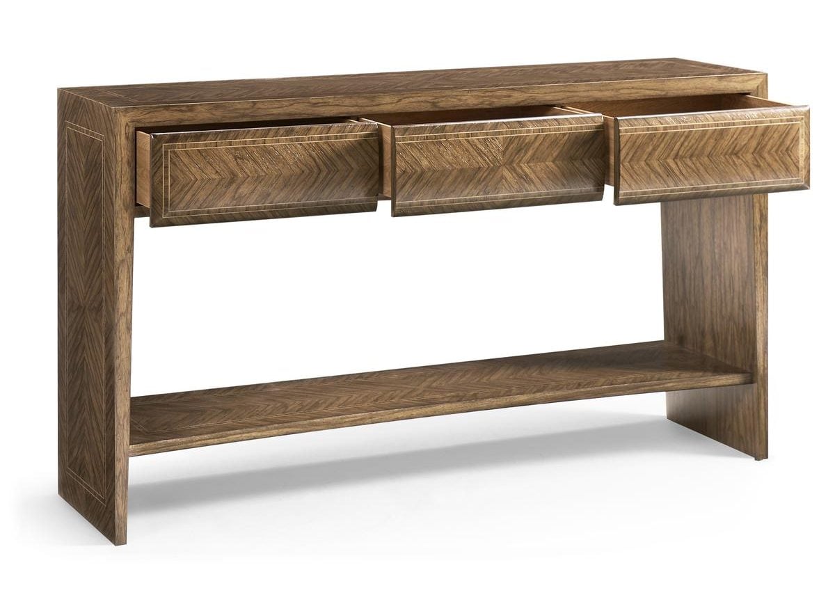 Product Description: Jonathan Charles 496223-MAR Montclair Console Table - The Montclaire Console Table highlights the sophistication of meticulously cut veneers and clean architectural lines. Its expansive form is wrapped in bold herringbone patterns crafted from Ofram and Sycamore veneers, all brought to life under a rich Medium Argentinian Walnut finish that enhances their depth and movement. The broad top and full-length lower shelf offer practical display space, while the integrated apron drawers provide discreet storage without interrupting the table’s sleek geometry. Subtle metal accents add a refined edge, underscoring the table’s tailored, modern elegance. Artfully crafted and visually grounded, the Montclaire Console Table serves as a statement piece in entryways, living rooms, or dining spaces.