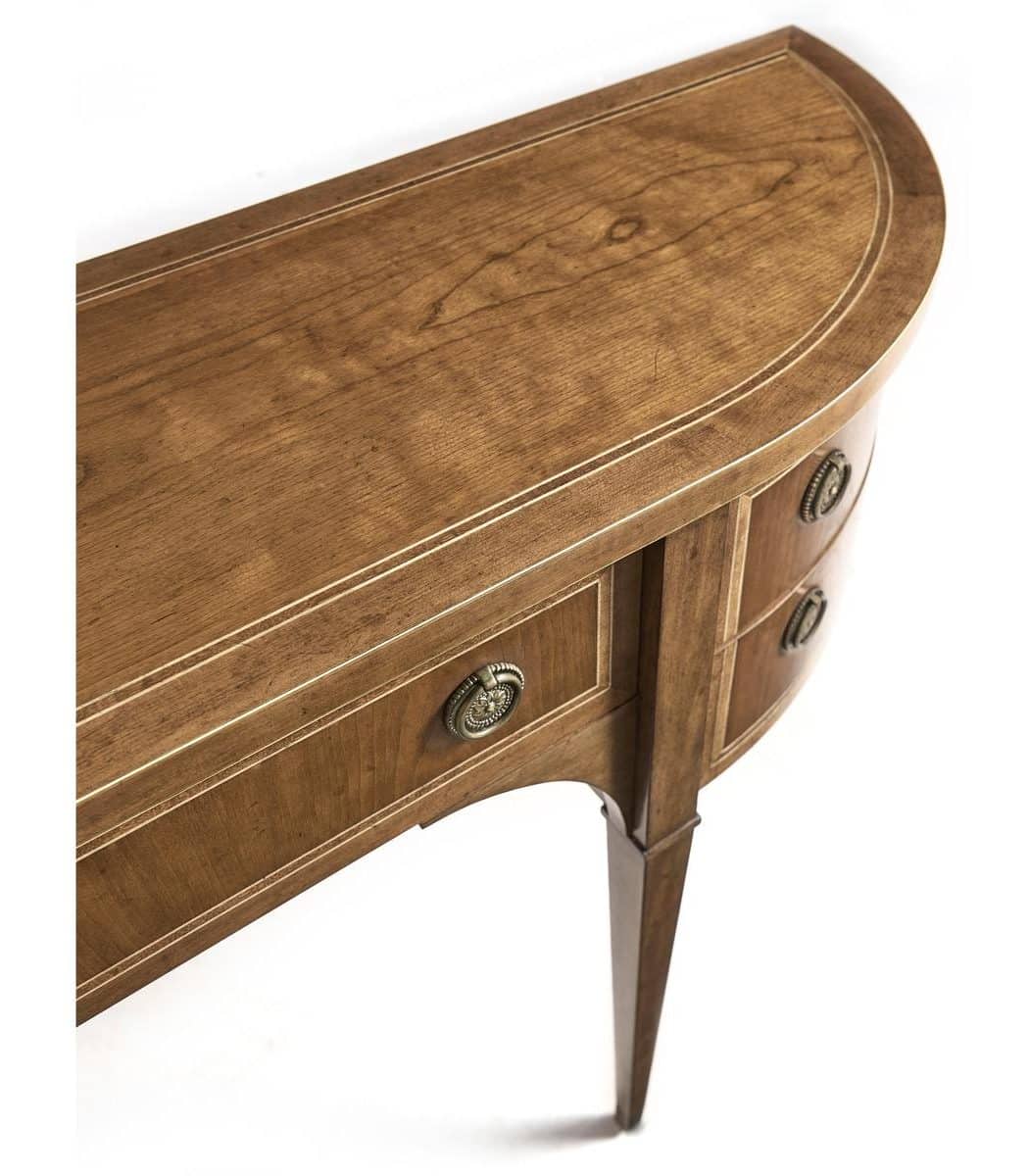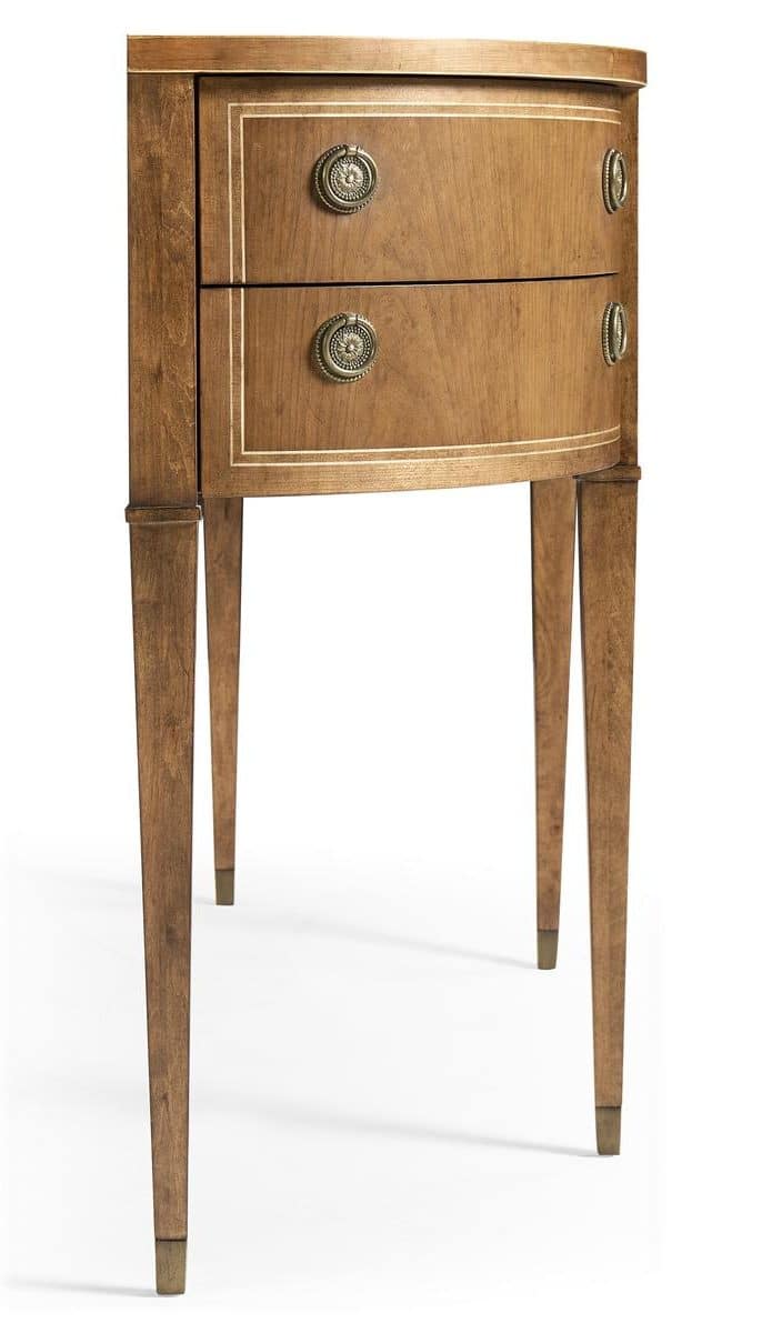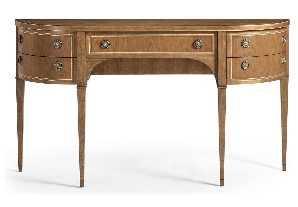 Product Description: Jonathan Charles 496224-SBC Sundial Demilune Console Table - Made with cherry veneers in a Sun Bleach Cherry finish, it highlights warm tones and natural grain variation. Its sculptural silhouette, tapered legs, and subtle molding create a timeless look, while five drawers offer practical storage. Finished with round metal pulls, this piece blends functionality with sophisticated craftsmanship.
