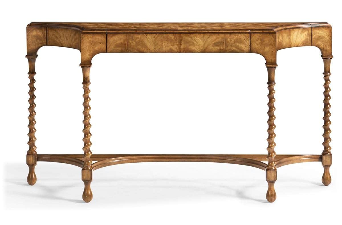 Product Description: Jonathan Charles 496230-CCJ Orsman Cresent Console Table - Graceful in proportion and refined in detail, the Orsman Crescent Console Table introduces a subtle architectural curve. The bowfront silhouette softens a hallway or sofa back, while a matched veneer top highlights the wood grain. Spiraled legs connect with a shaped stretcher that follows the arc. Finished in carmel walnut for warmth and sophistication.