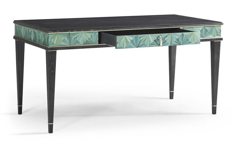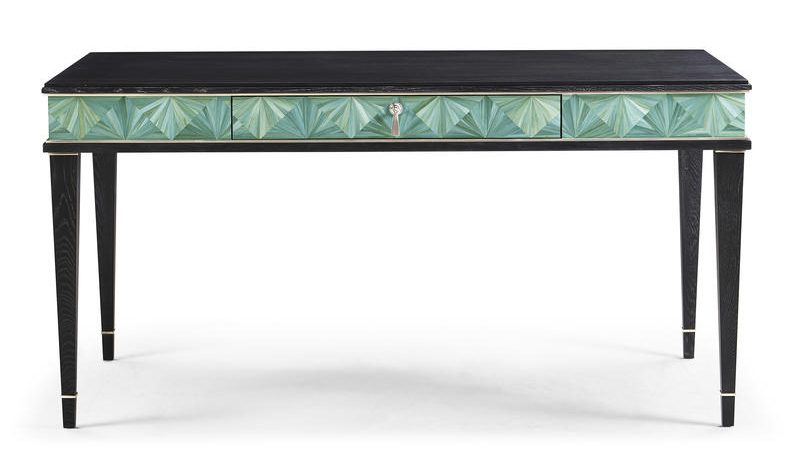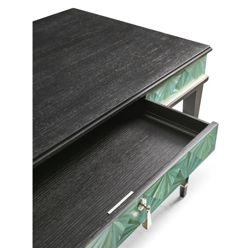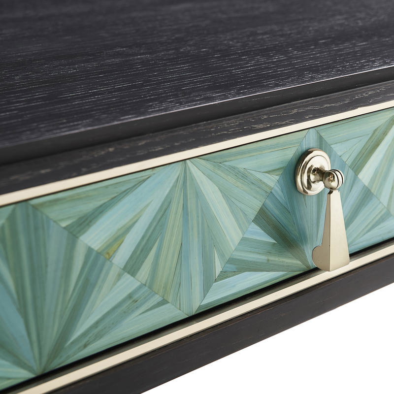 Product Description: Jonathan Charles 500549-SBE Azura Desk - The Azura Desk is a stunning showcase of modern craftsmanship and elegance. Its front features intricate straw marquetry in vibrant turquoise tones, hand-applied to create a mesmerizing starburst pattern. The marquetry is beautifully outlined in satin-finished stainless steel metal banding, adding a sleek, polished contrast to the natural texture. The desk's frame and legs are finished in rich ebonized oak, providing a sophisticated contrast to complement the striking design. With hand-cast hardware and ample workspace, the Sapphire Desk combines artistic beauty with functional sophistication, making it a perfect centerpiece for any office or study.