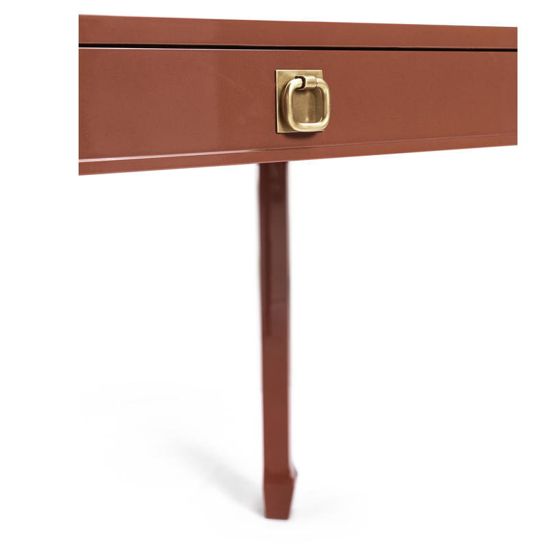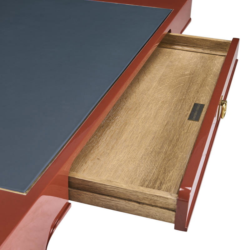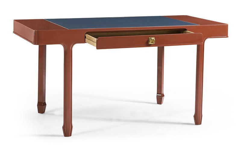 Product Description: Jonathan Charles 500563-LDR Polly Rose Desk - The Polly Rose Desk combines sleek modern design with bold, vibrant details to create a striking workspace. Finished in a high-gloss bold red lacquer, the desk exudes contemporary sophistication. The tabletop is inset with luxurious royal blue leather, offering a refined contrast and a stunning visual statement. With its eye-catching color and functional elegance, the Polly Rose Desk is the perfect centerpiece for any home office or study, bringing both style and practicality to your workspace.