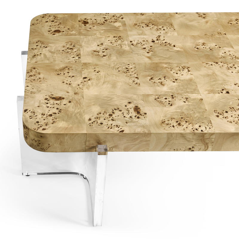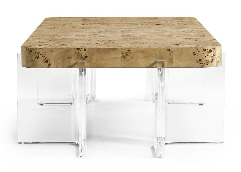 Product Description: Jonathan Charles 500569-NMB Veil Rectangular Cocktail Table - Featuring a light burl top, the table adds warmth and texture to any space, while its clear acrylic pedestal creates a striking contrast and an airy, sophisticated look. This unique blend of materials highlights both refinement and minimalism, making the Veil Cocktail Table a perfect centerpiece for any living room, offering both functionality and modern style.