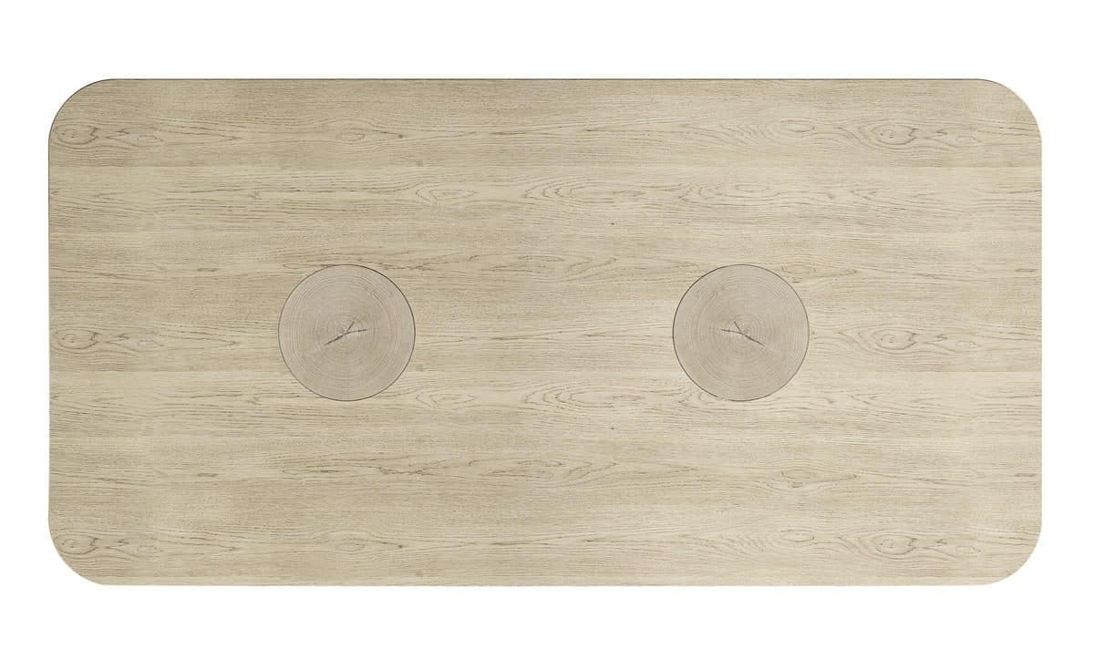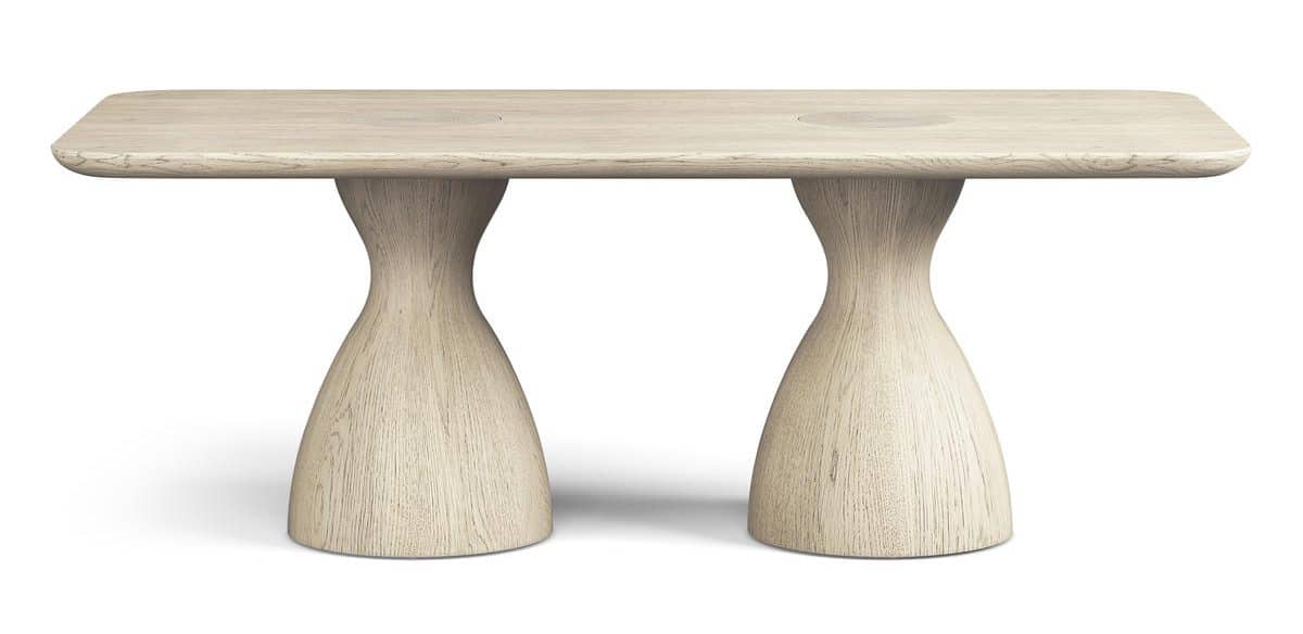 Product Description: Jonathan Charles 500582-BLO-86L 86" Seamount Rectangular Dining Table - With sculptural simplicity and grounded elegance, the Seamount Dining Table brings organic artistry to contemporary settings. Crafted in oak and finished in a soft White Washed Oak, the design features dual pedestal bases that evoke a sense of natural balance and architectural stability. The oyster-cut top showcases an intricate veneer layout reminiscent of a tree stump’s growth rings, offering subtle depth and character. A serene and earthy statement, this table anchors any dining space with thoughtful craftsmanship and quiet beauty.