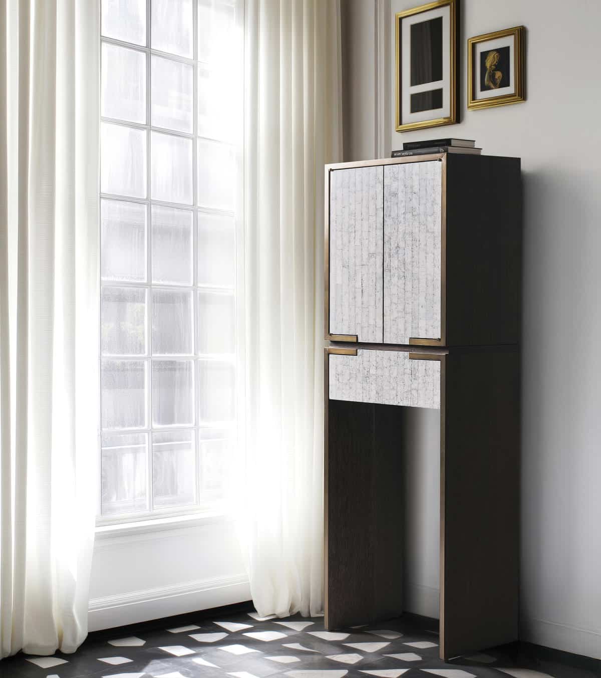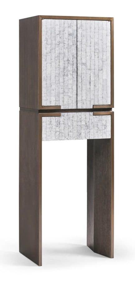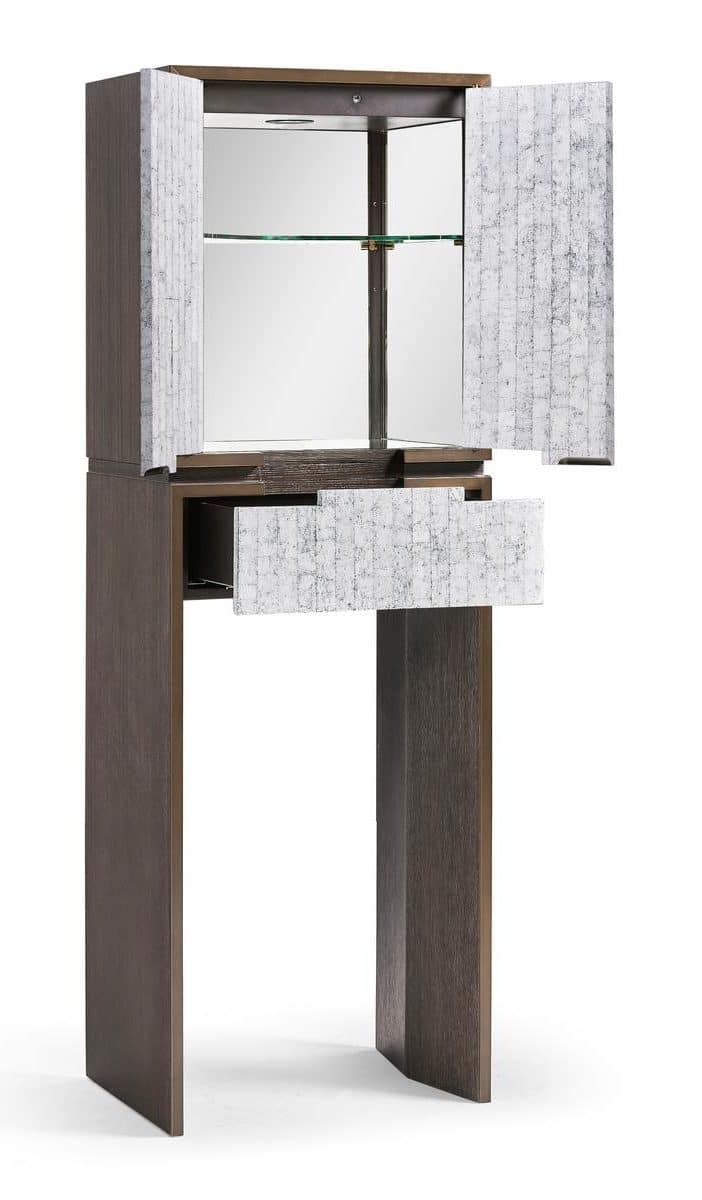 Product Description: Jonathan Charles 500584-EC001 Gaia Drink Cabinet - The Gaia Bar Cabinet blends natural artistry with refined functionality, featuring a striking hand-applied eggshell inlay on its door and drawer fronts that brings a subtle, organic shimmer to its design. Framed in a rich Chocolate Apricot finish on oak, its tall, sculptural silhouette opens to reveal a mirrored interior with a glass display shelf and integrated lighting, perfect for showcasing barware. A lower pull-out drawer provides additional storage, making this cabinet a compact yet luxurious centerpiece that effortlessly balances modern form with timeless craftsmanship.