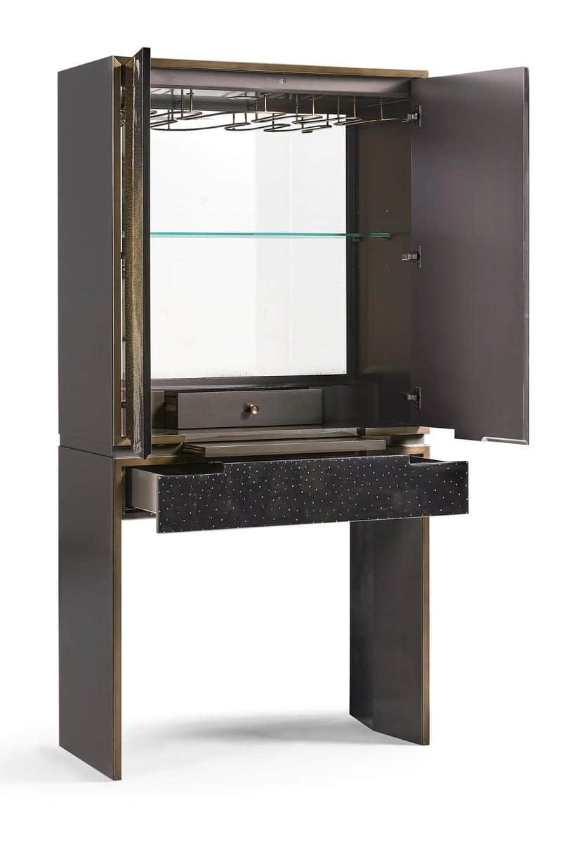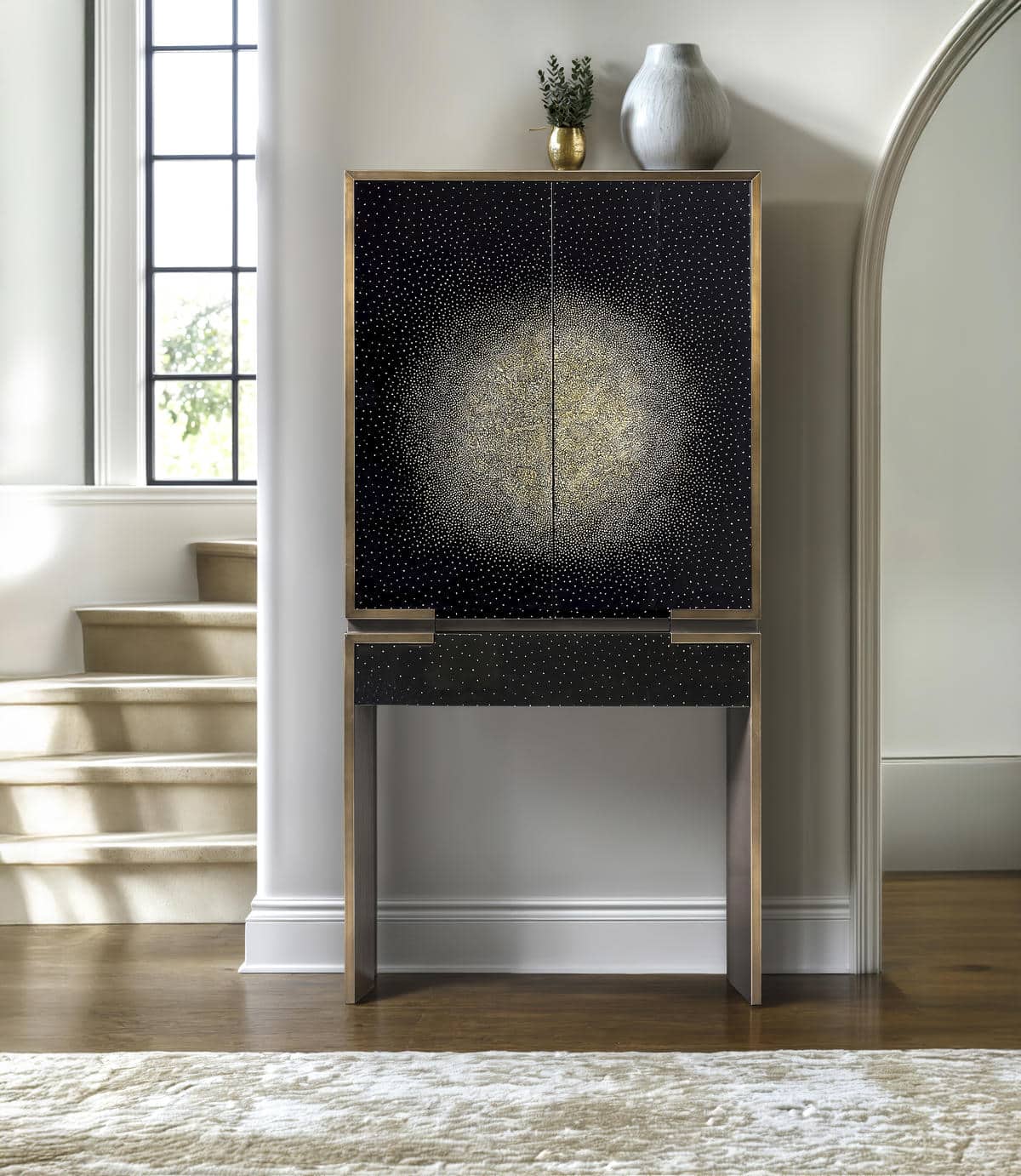 Product Description: Jonathan Charles 500587-EG001 Celeste Drinks Cabinet - The Celest Bar Cabinet is a radiant fusion of craftsmanship and cosmic beauty, featuring an intricate front design created through the eggshell inlay technique, forming a mesmerizing celestial pattern that shimmers across a deep, high-gloss lacquered surface. Framed in a sleek, contemporary profile, Celest opens to reveal a mirrored interior with a glass shelf, integrated lighting, and dedicated stemware racks—elevating both function and visual drama. A concealed drawer and pull-out tray provide additional storage, making this piece as practical as it is sculptural.
