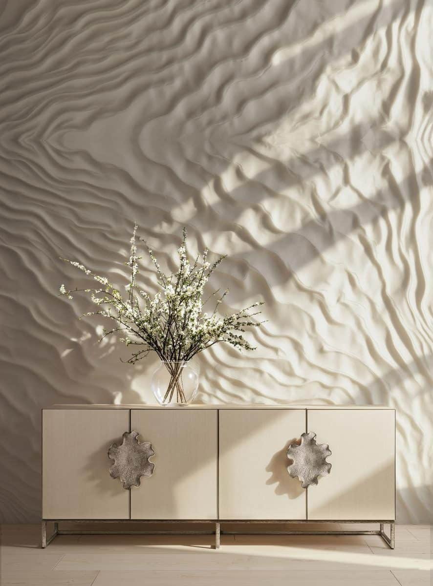 Rich with artful visual touches, the stirring Jonathan Charles Water Portfolio is flawlessly crafted and imbued with the luxurious textures of natural woven grasscloth, soft cream leathers, bone inlay and Koto veneers. This eclectic mix of materials, paired with sinuous and flowing architectural features reminiscent of waves, is a showcase of delightful dynamism with contrasting line and form. An exquisite appointment package of hand cast,custom hardware accentuates htis exceptional furniture portfolio.