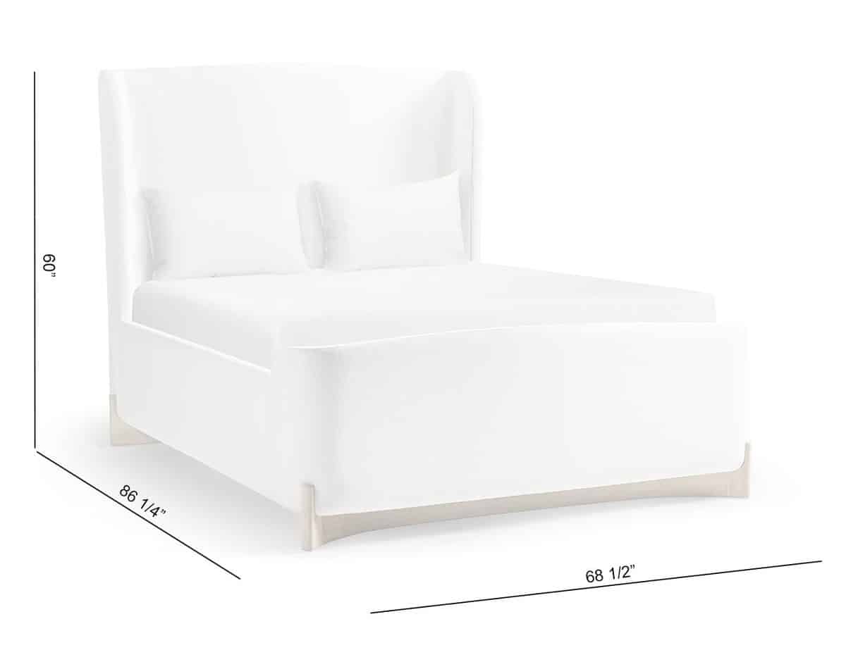 Product Description: Jonathan Charles 500600-BLO-Q-F067 Keel Upholstered US Queen Bed - The Keel Upholstered Bed embodies understated luxury with its sculpted curves and soft, enveloping presence. Wrapped in tailored upholstery, the generous headboard sweeps gently outward, offering both comfort and architectural elegance. A base of white washed oak anchors the piece, its graceful lines echoing the keel of a ship, strong, steady, and quietly refined. Balanced between modern simplicity and timeless warmth, this bed is designed as the serene centerpiece of the bedroom.