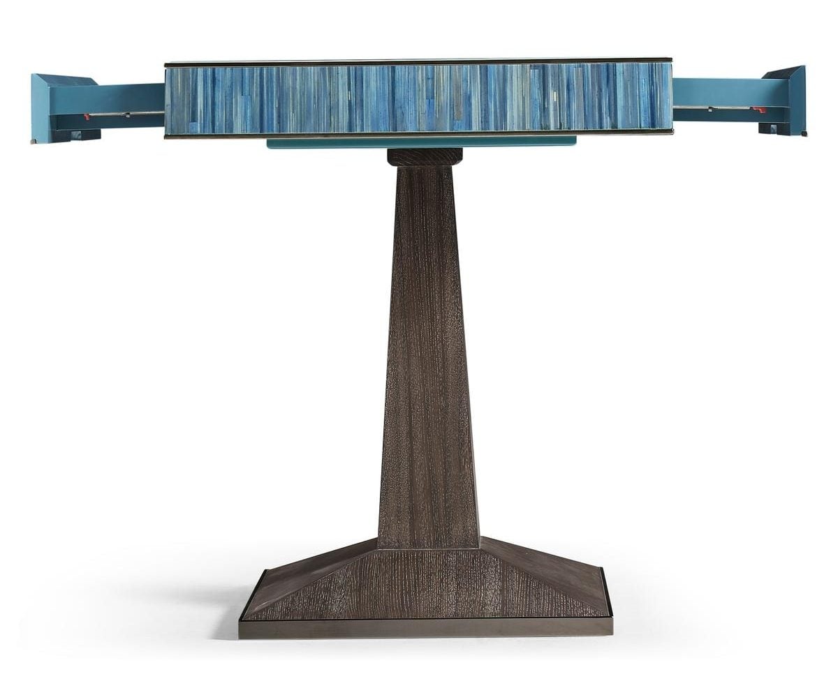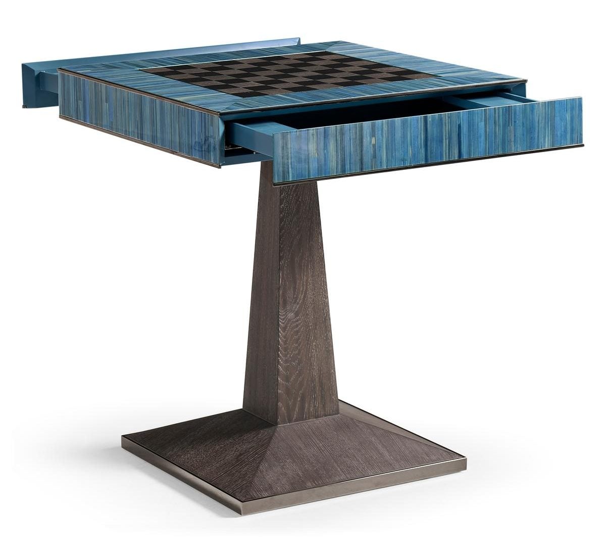 Product Description: Jonathan Charles 500606-ABS Sapphire Straw Game Table - The Sapphire Straw Game Table transforms a classic pastime into a work of art. Its square tabletop showcases a meticulously crafted gameboard inlaid with hand-applied straw marquetry, shimmering in rich tones of Azure Blue Straw. The luminous vertical straw wrapping along the apron adds movement and depth, highlighting the material’s natural iridescence. A sleek metal trim frames the top, lending refined contrast to the expressive surface. The geometric pedestal base, crafted in a deep wood finish with a matching metal foot, offers a sculptural foundation that balances modern elegance with artisanal detail. Both functional and visually captivating, this table elevates game play to a luxurious design experience.