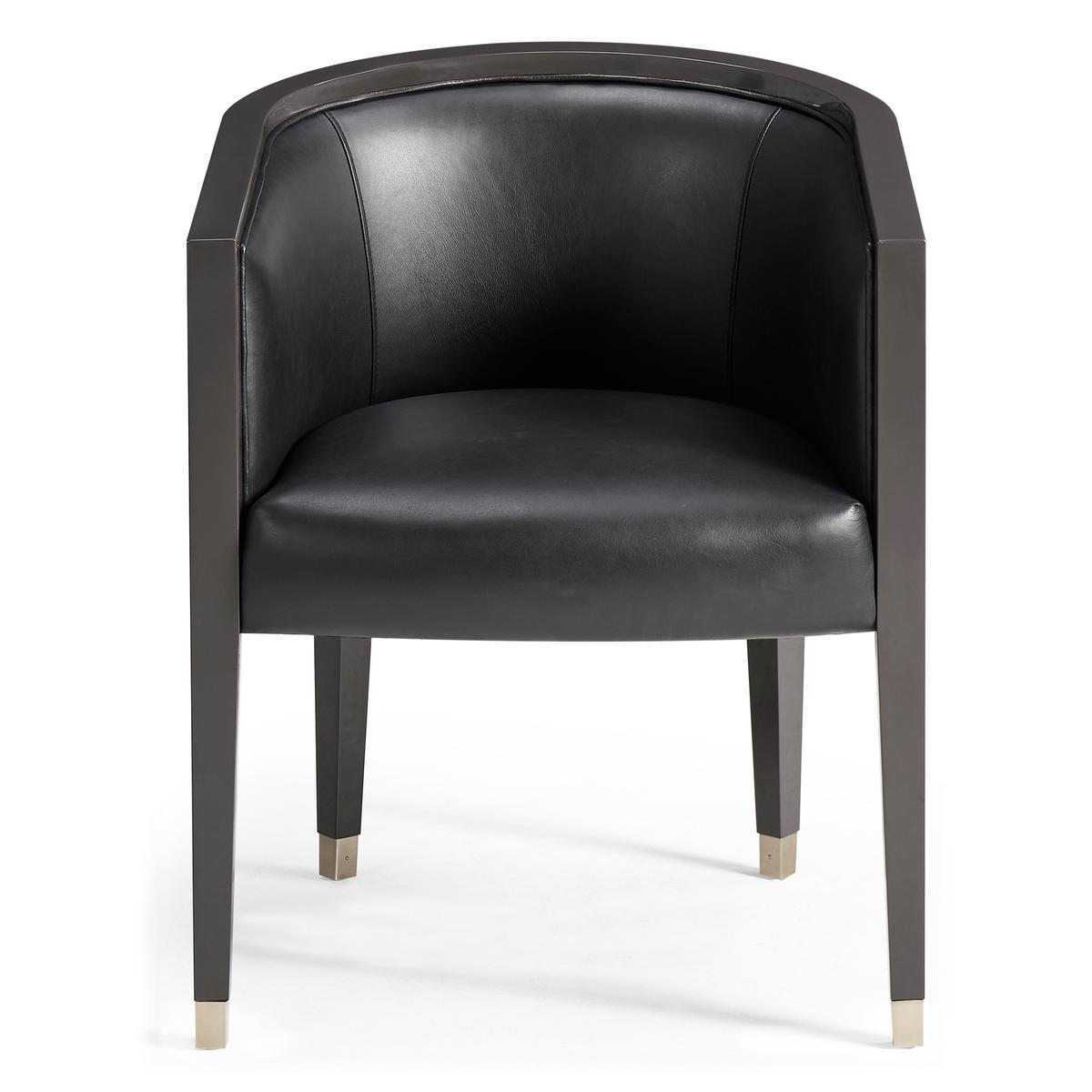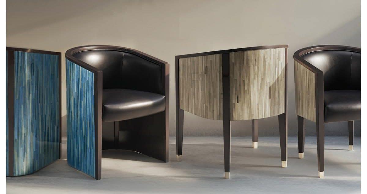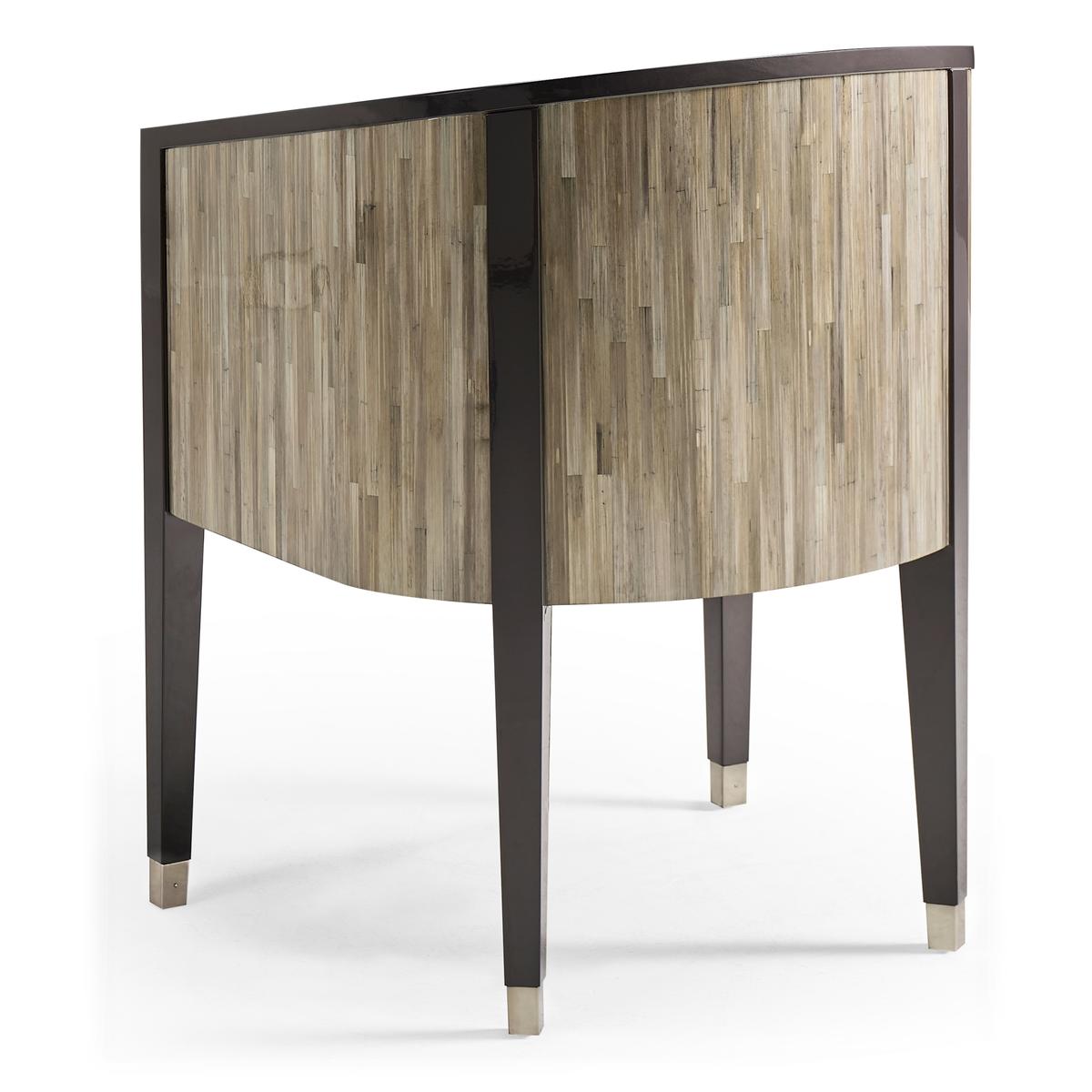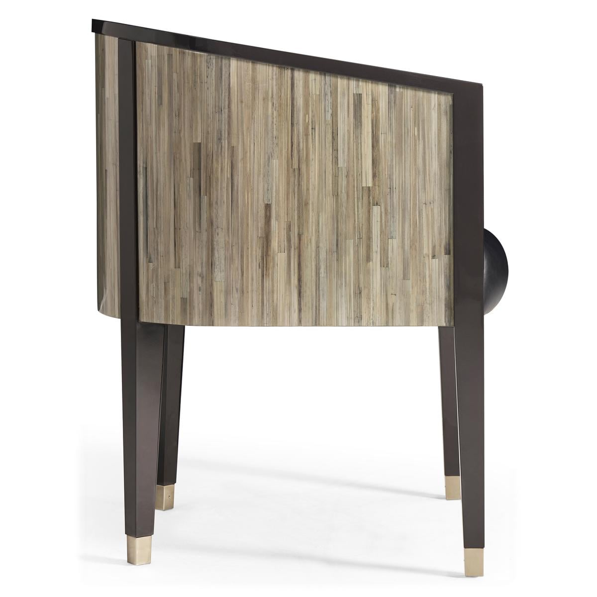 Product Description: Jonathan Charles 500608-VGS-L047 Terra Barrel Dining Chair - The Terra Barrel Dining Chair brings sculptural elegance and modern materiality to the dining room. Its curved barrel back, upholstered in smooth premium leather, creates a refined and comfortably enclosed seat. The exterior panels showcase meticulously hand-laid straw inlay marquetry, introducing a striking natural texture that contrasts beautifully with the chair’s dark, architectural frame. Slender tapering legs are finished with subtle metal-capped feet, adding a touch of sophistication. Artful and inviting, this chair seamlessly blends organic craftsmanship with contemporary form.