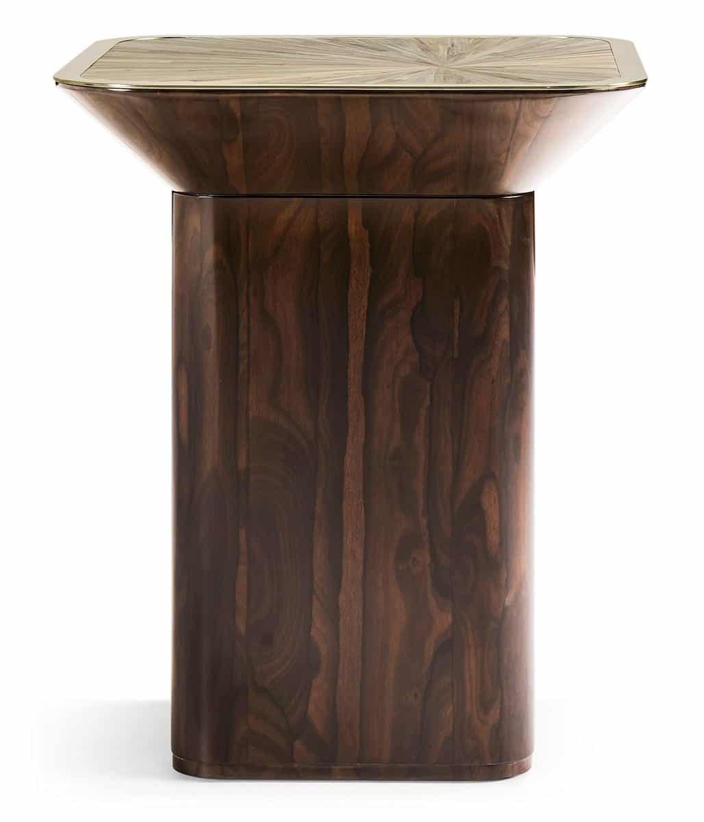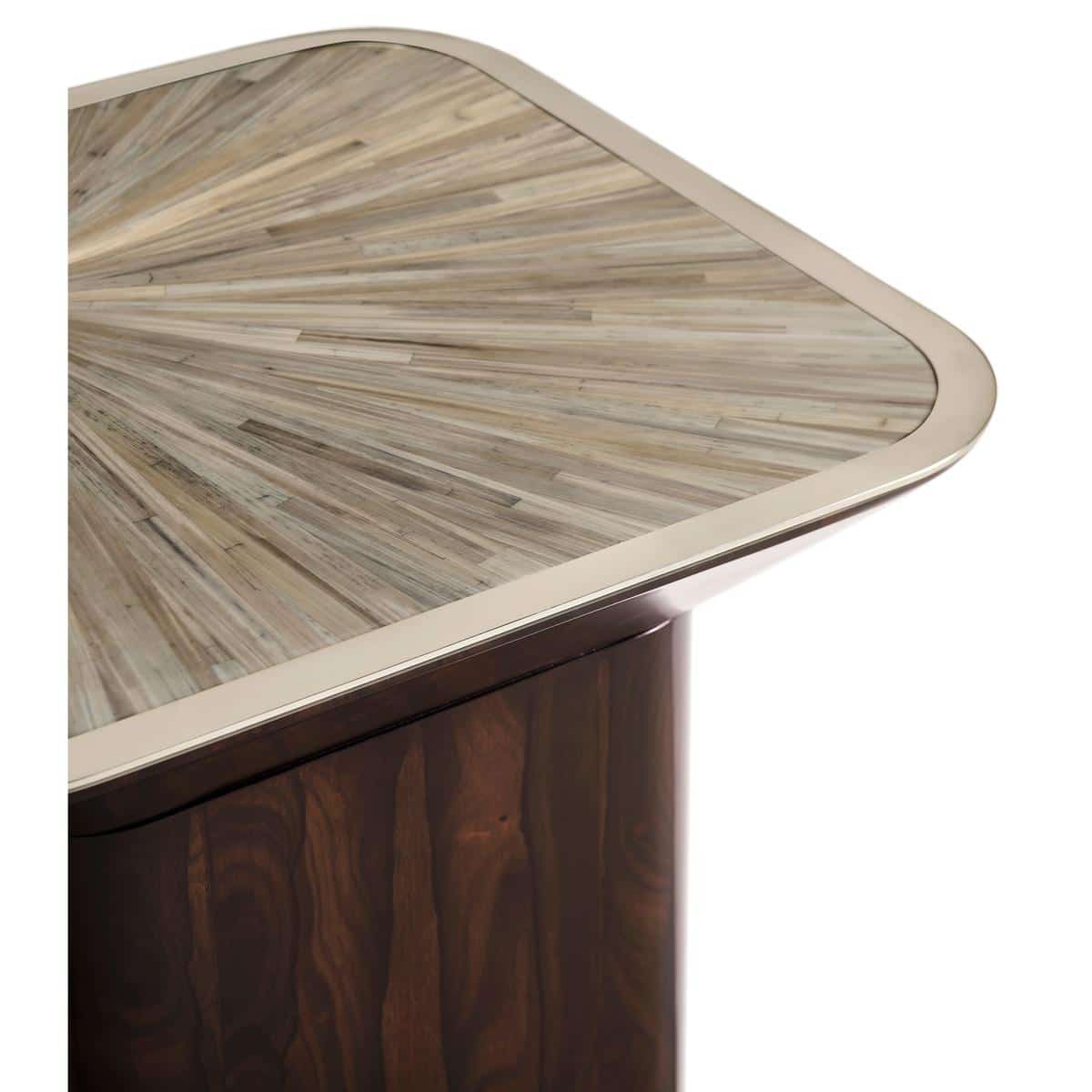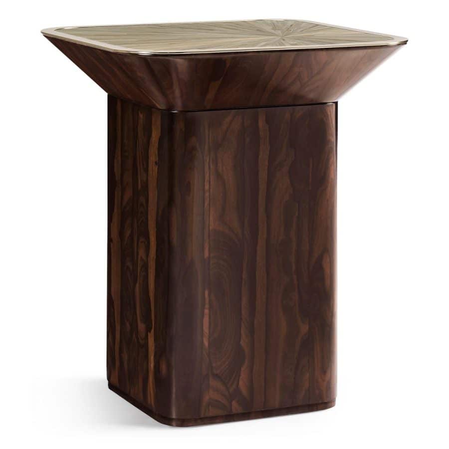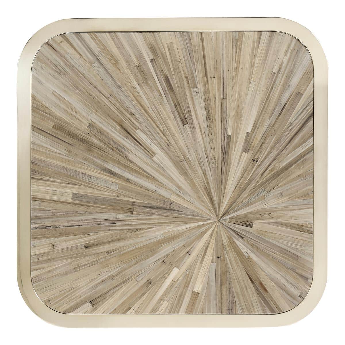 Product Description: Jonathan Charles 500609-VGS Terra Square Lamp Table - The Terra Square Lamp Table celebrates the artistry of natural materials through a striking interplay of color and texture. Its square top features hand-applied Natural Straw arranged in a radiant marquetry pattern, creating a vivid, organic surface that shimmers with tonal depth. A slim metal band frames the top, adding a crisp modern edge. The gently flared upper form transitions into a rounded, column-style base wrapped in rich wood grain, grounding the piece with warmth and sculptural balance. Sophisticated and expressive, the Terra Lamp Table brings a bold, jewel-toned accent to any room.