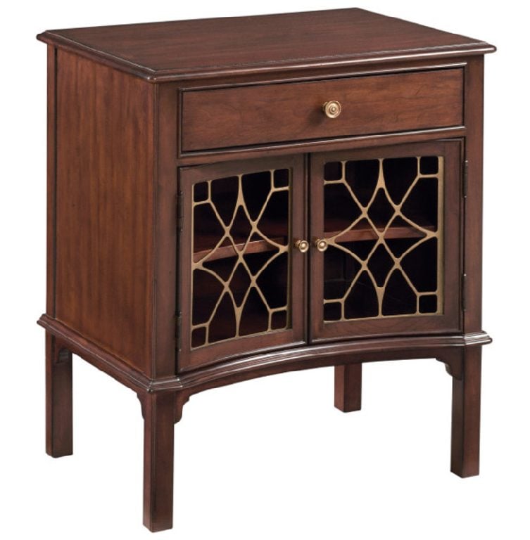 Product Description: Kincaid Furniture 607-421 Hadleigh Bedside Table - Take things a little more eclectic while maintaining the right styling with the Hadleigh Bedside Table. It features contrasting grill-work framed in shaped doors with an adjustable shelf behind the doors. Other design elements include a Chippendale inspired leg. This piece makes a great addition to any room where the mood calls for refined, classic solid wood furniture.
