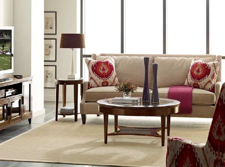 Product Description: Kincaid Furniture 77-024 Elise Aura Cocktail Table - A complete different living room option, the round Aura glass cocktail table has two tiers of glass with subtle metal trim. The shape makes it a great option for everything from medium sized sofas to sectional designs.