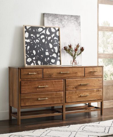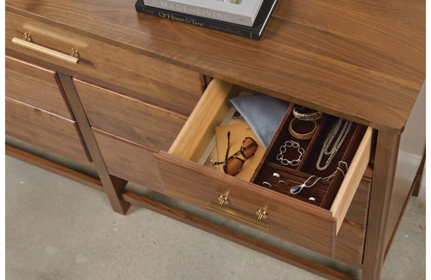 Product Description: Kincaid Furniture 315-130 Wonderland Seven Drawer Dresser - Few natural materials have a personality as pleasing, interesting, and unique as solid walnut. Long considered America's most premier material for cabinetry and architectural woodworking, American Black Walnut is best utilized in larger pieces where it can be fully appreciated. The Wonderland Dresser creates an ideal design to showcase this beautiful material. Among the seven drawers are four large drawers ideally sized for folded clothing, one medium drawer across the top and two smaller drawers to help keep thing organized and accessible. The Wonderland dresser also includes integrated levelers in the feet.