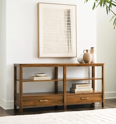 Product Description: Kincaid Furniture 315-925 Boca Console Table - While it may fall in the sofa table category, the Boca Console Table is so much more than that! Measuring 64 inches across, provides more function an style than most pieces of its type. Besides the beauty that comes from solid American Black Walnut, the Boca Console Table uses an interesting layout that adds dimension, display function, and some extra drawer storage. This thoughtfully designed and scaled console table is ideal for use behind the sofa in an open concept living area, as an accent in an entry space, or even underneath a wall mounted television.