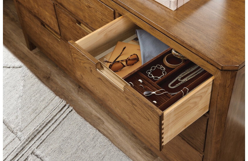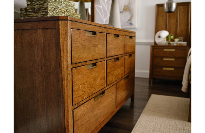 Product Description: Kincaid Furniture 430-130 Aspire Profile Dresser - Crafted with solid cherry, the Profile Dresser features eight drawers and is the primary bedroom storage piece for the Aspire collection. The dresser takes its name from the distinctive profile of the front post, highlighting the natural character of its solid cherry construction. This detail frames fitted, full-depth drawers for a clean, transitional style. Framed, solid wood end-panels and inset custom hardware create the finishing touches for a timeless design.