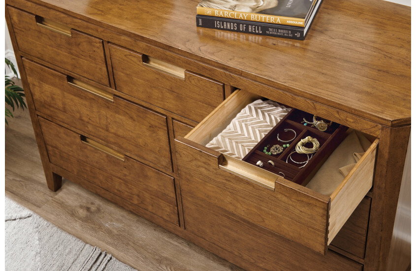 Product Description: Kincaid Furniture 430-131 Aspire Scale Dresser - If large drawer storage is the need, look no further than the Aspire Scale Dresser. Its seven drawers are made up of three medium sized drawers and four large, deep drawers. This storage configuration makes good use of the 56 inch width that the Scale Dresser occupies. Stylistically, the Scale Dresser makes good use of the solid cherry construction by showcasing this sought after North American hardwood. The finish uses minimal coverage to allow the wood grain to take center stage. A lined jewelry tray is included in the top right drawer.