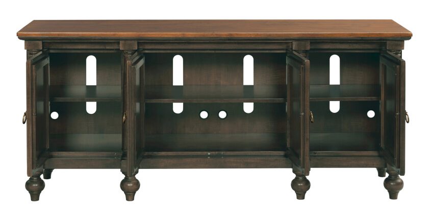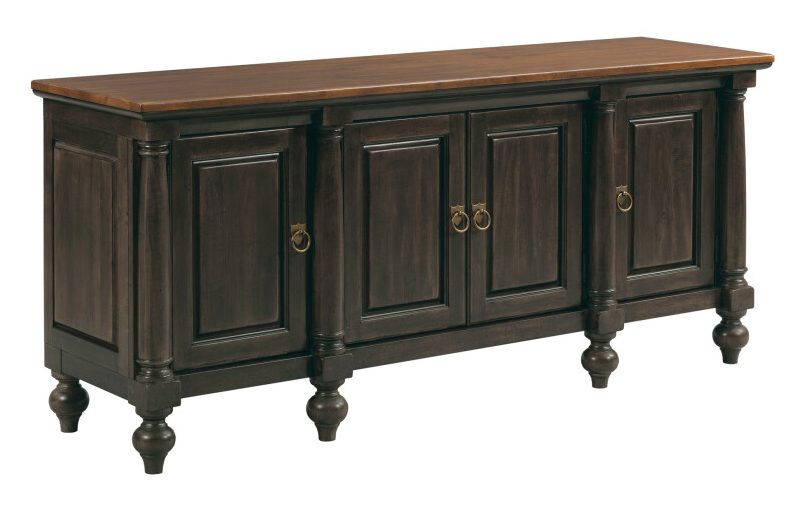 Product Description: Kincaid Furniture 487-585B Harrison Console - Finish: Bridgetown Black. Top Finish: Heritage Maple. Hardware: Antique Brass. Four Doors. Three Adjustable Wood Shelves.