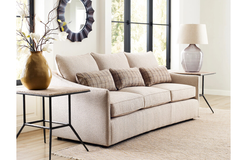 Product Description: Kincaid Furniture UPH-347-86 Ari Sofa - The Ari collection features complex yet graceful lines that make it stand out in subtle ways. An elongated curve along the length of the sofa is framed with crisply detailed arms that are trimmed in welt to accentuate the silhouette. The welt transitions to the outer edge of the arm where it curves upward to the back and around. This beautiful group offers a broad range of stylish configurations. Here it is shown with a three seat cushion and three back cushion layout. The back cushions frame three bed pillow style kidney pillows. The kidney pillows are sized to match the inside arm and can be repositioned there and still look purposefully "just right".