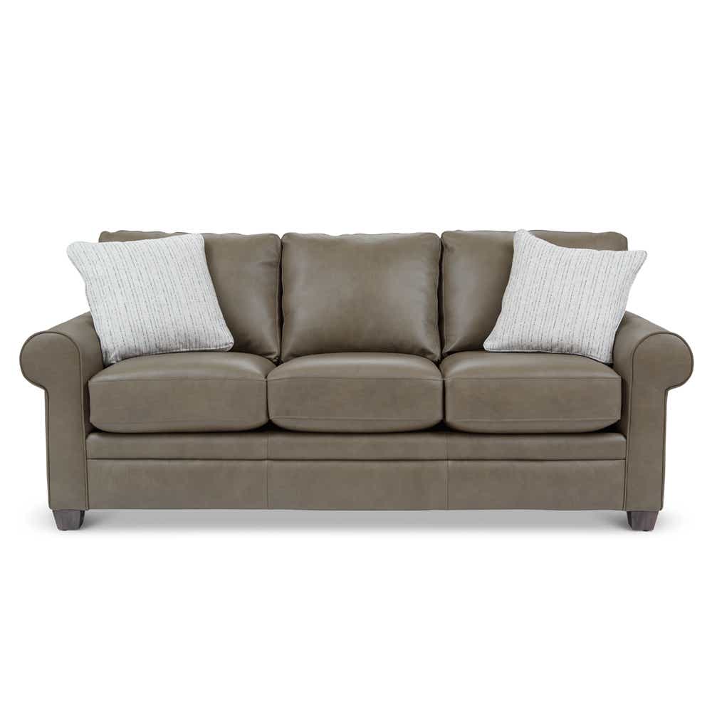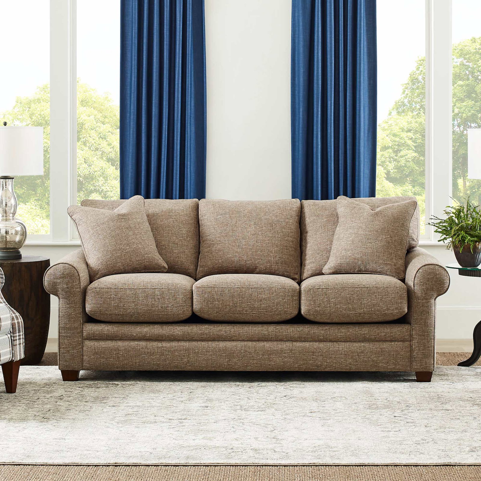 Product Description: La-Z-Boy 610613 Olson Sofa - With its graceful classic form, the Olson Sofa adds polish to décor while keeping a loose, casual vibe. Rolled arms, welt trim and wood legs lend elegance to plush back cushions. Tailored seats provide comfy support for posh parties or family fun!