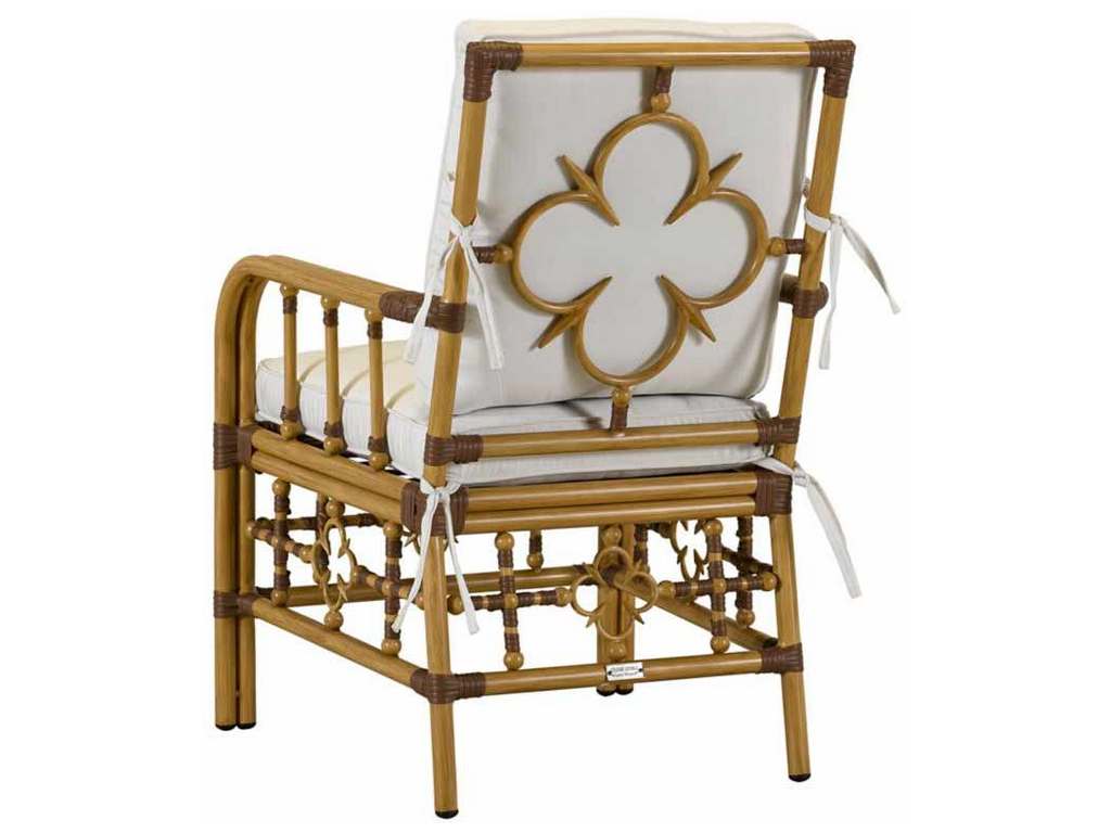Product Description: Lane Venture 216-79 Mimi by Celerie Kemble Mimi by Celerie Kemble Dining Arm Chair - Designed by Celerie Kemble, classic styling and first class comfort is what makes our Mimi dining chair the best seat on the patio. Inspired by vintage Palm Beach, the chair is eloquent with details that are flirtatious, whimsical and feminine. Made from the highest quality of extruded aluminum, the powder coated frame is hand- finished to resemble natural rattan and can stand up to any type of weather. FRAME: Premium, weather resistant powder-coated aluminum frame with polyethylene synthetic fiber wrap. FEATURES: Distinct Quatrefoil design. Includes back cushion. CUSHIONS: Removable cushion. CUSHION CORE: Fiber construction with drainable mesh on bottom. Optional fiber-wrapped foam with all fabric casing available. CUSHION STYLE: Box-border with self-welt. FABRICS: Available in all LANE VENTURE fabrics. FINISH: 657 Raffia, as shown.