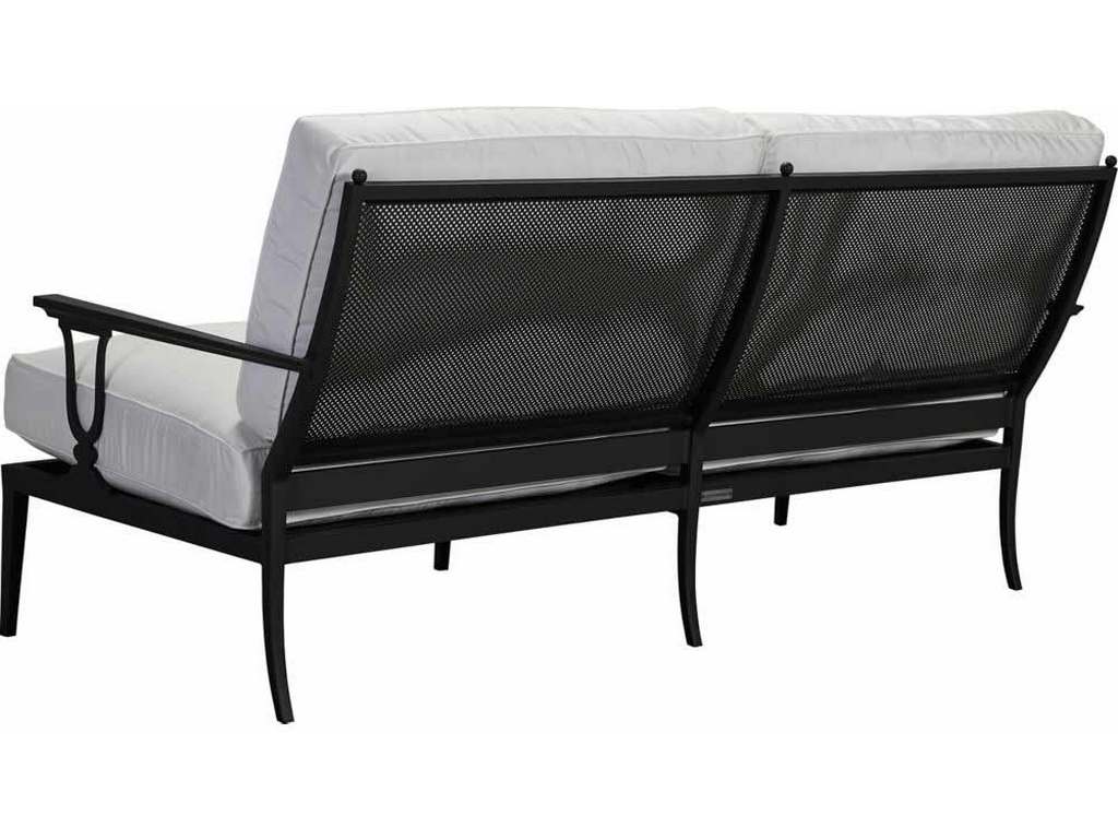 Product Description: Lane Venture 231-03 Winterthur Sofa - Inspired by the gracefully subtle lines of the classic Klismos style, our Winterthur Estate sofa features a mesh aluminum back capped with finials on each end of the top rail. Modern design details include a sleek arm design featuring the silhouette of a pedestal urn and a slightly tapered flat arm. Surround yourself in luxurious comfort as you sink into our unique outdoor cushion. We powder-coat this all-aluminum frame with a chic and durable matte black so that you know it will withstand all types of weather without sacrificing its beauty. FRAME: Premium, weather resistant powder-coated aluminum frame. FEATURES: Back panels have pierced aluminum "Mesh" décor accented with aluminum finials. The arm is cast aluminum with an urn profile design. CUSHIONS: Removable cushions. CUSHION CORE: Fiber coil construction with dr ainable mesh on bottom. Optional fiber-wrapped foam with all fabric casing available. CUSHION STYLE: Box-border with self-welt. FABRICS: Available in all LANE VENTURE fabrics. FINISH: #694 Obsidian Black, as shown.