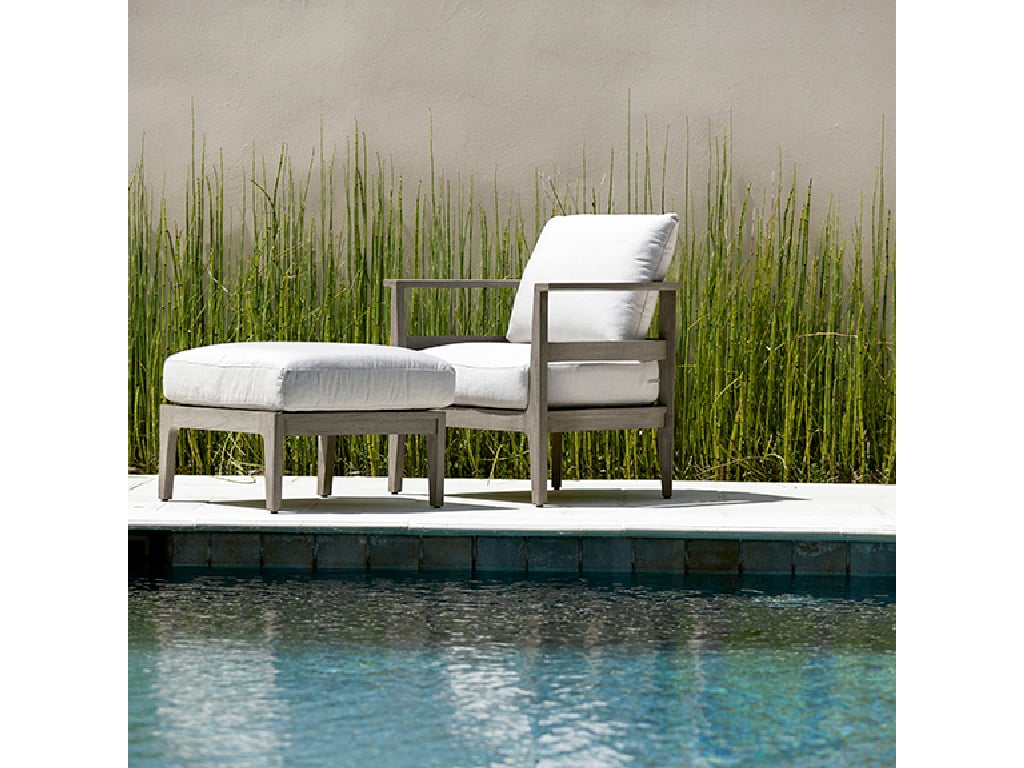Faceted arms and subtle radius edges are just a few of the refined details that highlight and define the soft curves of the frame. The applied soft grey finish emulates the appealing natural patina of aged teak.