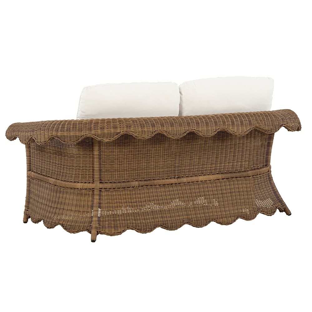 Product Description: Lane Venture 526-02 Cleary Loveseat - Hand-woven wicker over weather-resistant, premium powder-coated aluminum. Whimsical scallop design on apron. Small scale seating. Fiber coil construction with fabric casing and drainable mesh bottom. CUSHION STYLE: Box border seat, weltless with top-stitch tailoring. Knife-edge back pillows. Available in all LANE VENTURE fabrics. Finish: Barley
