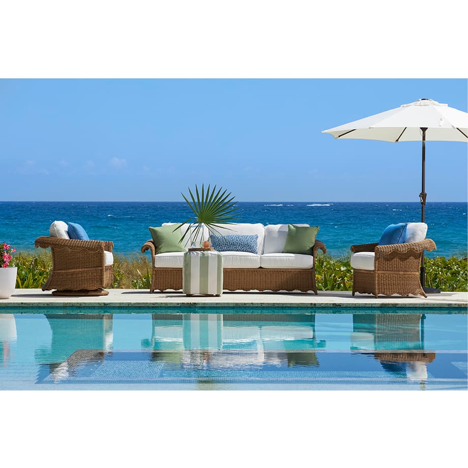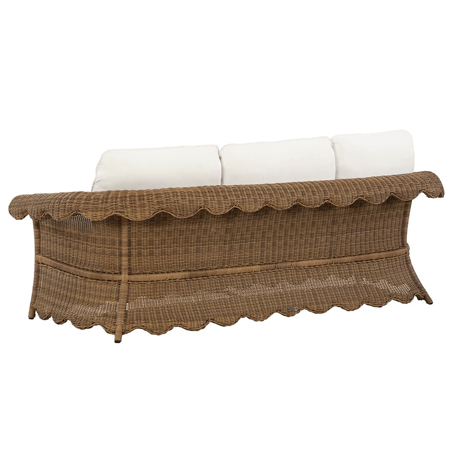 Product Description: Lane Venture 526-03 Cleary Sofa - Hand-woven wicker over weather-resistant, premium powder-coated aluminum. Whimsical scallop design on apron. Small scale seating. Fiber coil construction with fabric casing and drainable mesh bottom. CUSHION STYLE: Box border seat, weltless with top-stitch tailoring. Knife-edge back pillows. Available in all LANE VENTURE fabrics. Finish: Barley