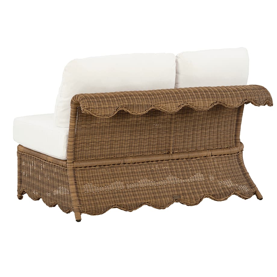 Product Description: Lane Venture 526-21 Cleary LF One Arm Loveseat - Hand-woven wicker over weather-resistant, premium powder-coated aluminum. Whimsical scallop design on apron. Small scale seating. Fiber coil construction with fabric casing and drainable mesh bottom. CUSHION STYLE: Box border seat, weltless with top-stitch tailoring. Knife-edge back pillows. Available in all LANE VENTURE fabrics. Finish: Barley