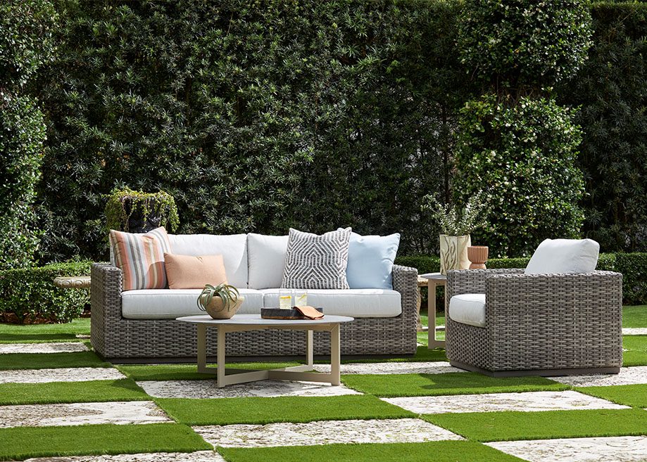 Experience the contemporary simplicity of the Hyannis collection. Seating and modular pieces exude modern sophistication with their clean, modern shape, plinth base, and wide-rounded weave in Nantucket Fog. The occasional tables, crafted from durable Resysta in Shale, are designed to replicate the wood look.