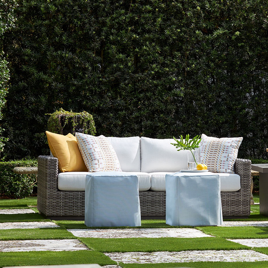 Product Description: Lane Venture 535-03 Hyannis Sofa 2/2 Cushion - Hand-woven wicker over weather-resistant, premium powder-coated aluminum. Fully woven frame, Resysta plinth base and modern track arm. Fiber coil construction with fabric casing and drainable mesh bottom. Optional fiber wrapped foam with all fabric casing CUSHION STYLE: Box border seat, weltless with top-stitch tailoring. Knife-edge back pillows. Optional box border with welt. Available in all LANE VENTURE Fabrics.