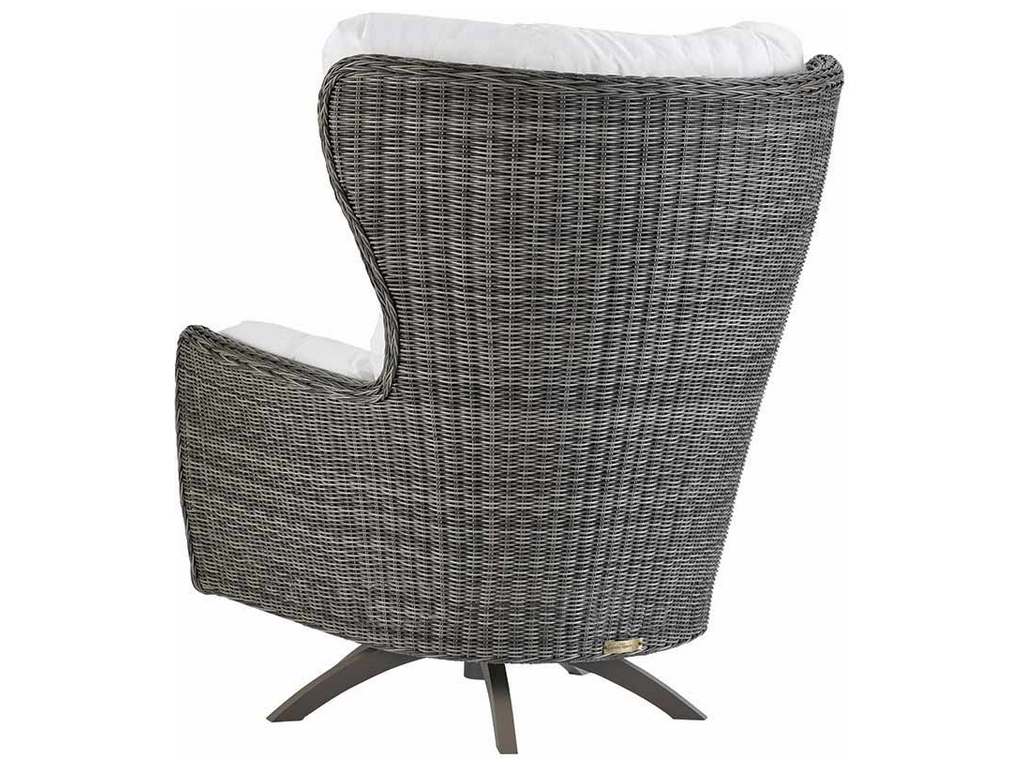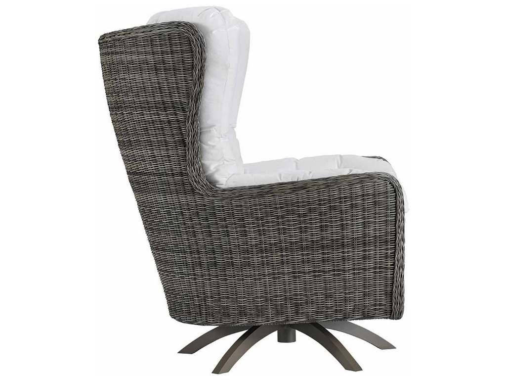 Product Description: Lane Venture 549-75 Cocoon High Back Swivel Lounge Chair - Our Cocoon lounge chair is a modern inerpretation of popular organic mid-century shapes. Featuring weathered hues of gray synthetic woven material, this chair features a fixed swivel base that is powder-coated aluminum for durability against the weather. FRAME: Weather-resistant, high UV polyethylene synthetic fiber, hand-woven over premium aluminum frame. FEATURES: Contoured, sculptural lines inspired by popular mid-century designs. Tufted back and inside arm. Powder-coated aluminum swivel rocker base. CUSHIONS: Removable cushions. CUSHION CORE: Fiber coil construction with drainable mesh on bottom. Optional fiber-wrapped foam with all fabric casing available. CUSHION STYLE: Box-border, weltless with top-stitch tailoring. FABRIC: Available in all LANE VENTURE fabrics. FINISH: 180 Alder, as shown