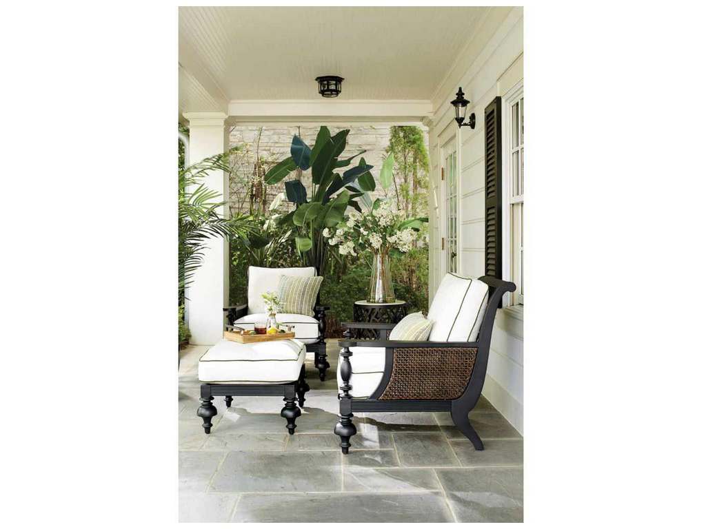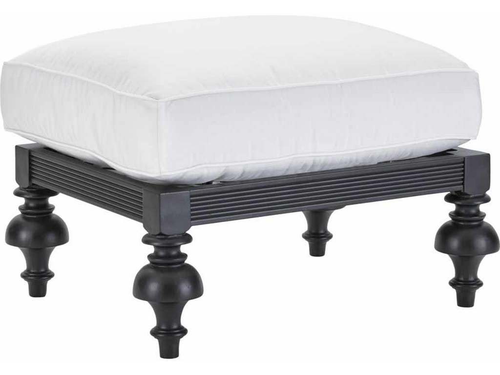 Product Description: Lane Venture 5531-05 Hemingway Islands Ottoman - Enjoy a classic West Indies island look with the elegant style of Hemingway Islands. Distinguished by robust cast aluminum leg turnings and wide paddle arms, the powder-coated finish is handcrafted in a sophisticated matte black truffle coloration. Accent items feature a cast aluminum stylized leaf that adds a modern tropical element to the assortment. This collection includes deep seating, occasional, dining and a coordinating fire pit. FRAME: constructed of rust and mildew resistant premium cast and wrought aluminum with a powder-coated finish. FEATURES: Classic West Indies look with cast aluminum leg turnings. CUSHION: Removable cushion. CUSHION CORE: Fiber coil construction with drainable mesh bottom. CUSHION STYLE: Box-border with self-welt. FABRICS: Available in all LANE VENTURE fabrics. FINISH: Powder-coated in a beautiful, rich "Black Truffle" finish, only as shown.