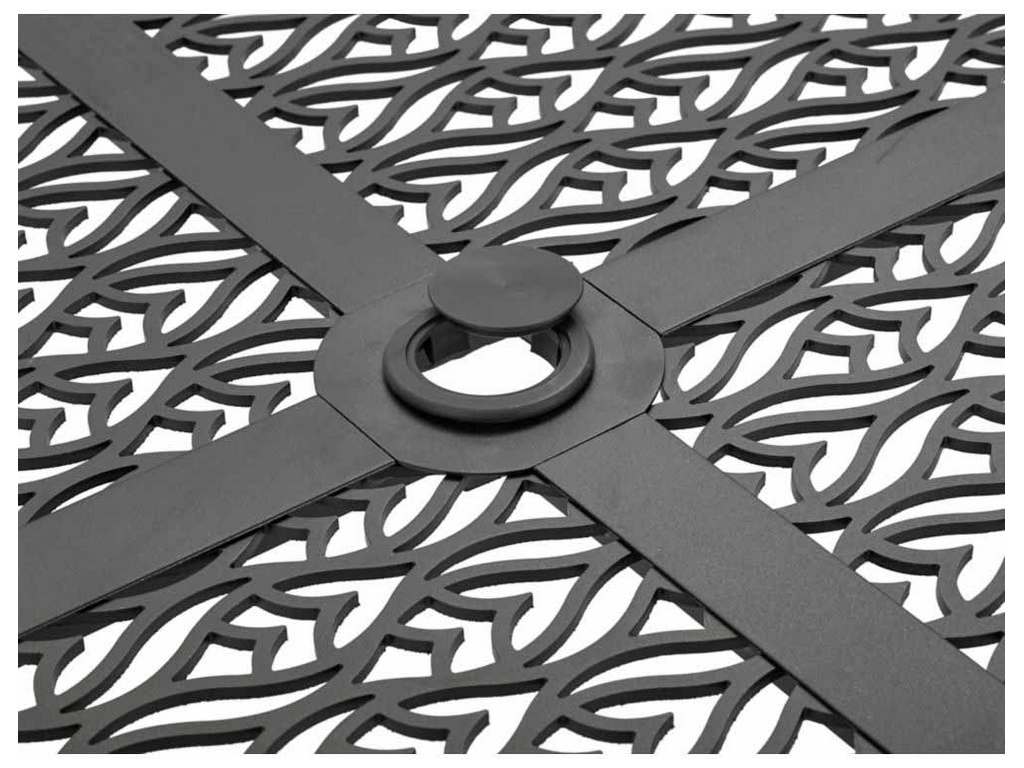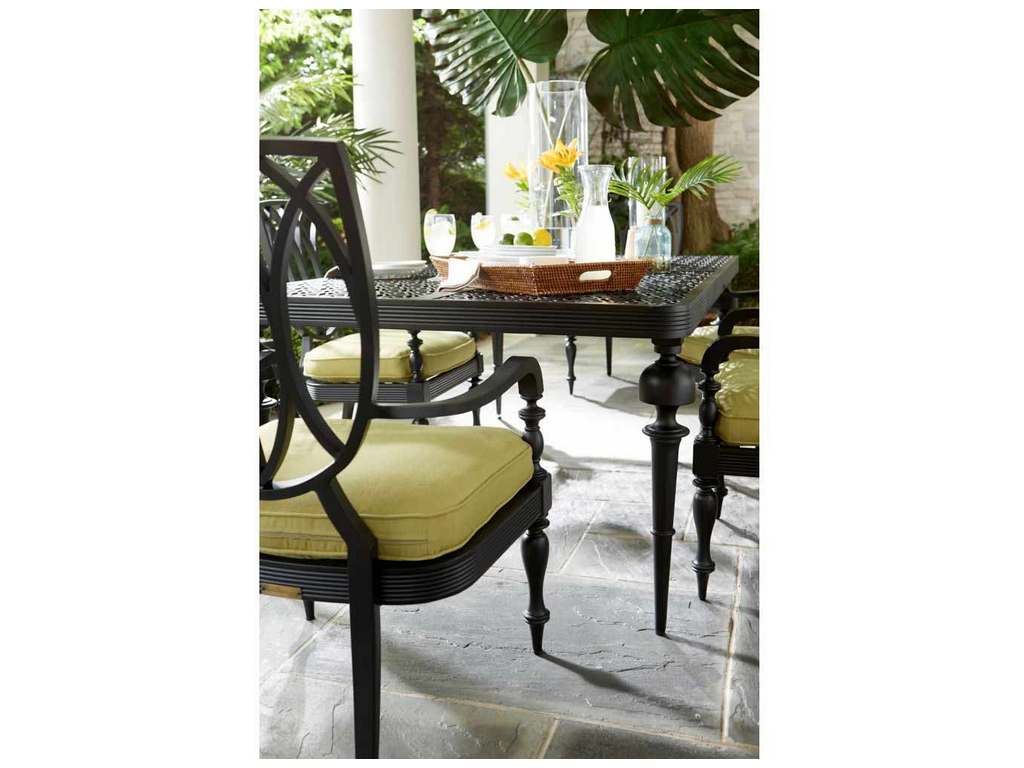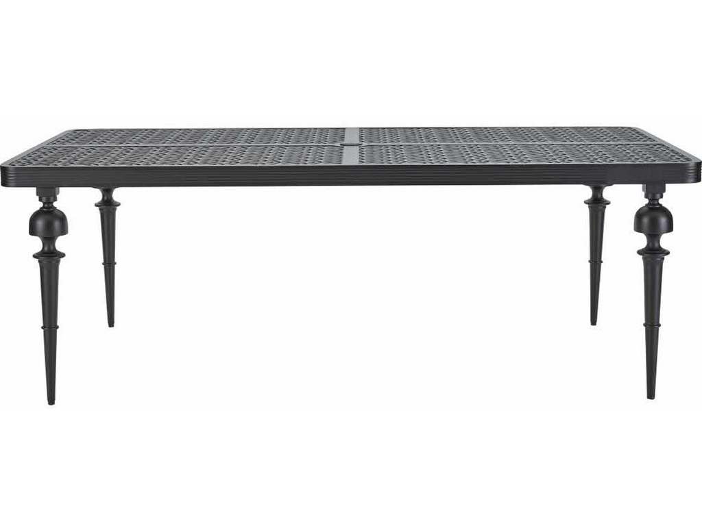 Product Description: Lane Venture 5531-84 Hemingway Islands Rectangular Dining Table - Enjoy a classic West Indies island look with the elegant style of Hemingway Islands with distinguished cast aluminum decor and cast aluminum leg turnings. The powder-coated finish is hand-crafted in a sophisticated matte black truffle coloration. Accent items feature cast aluminum stylized in a leaf design that adds a modern tropical element to the assortment. This collection includes deep seating, occasional, dining and a coordinating fire pit. FRAME: Constructed of rust and mildew resistant premium cast and wrought aluminum with a powder-coated finish. FEATURES: Classic West Indies look with cast aluminum leg turnings and cast aluminum top with stylized leaf design. Seats 6. 2" umbrella hole. FINISH: Powder-coated in a beautiful, rich "Black Truffle" finish, only as shown.