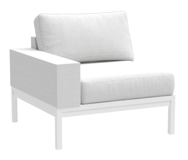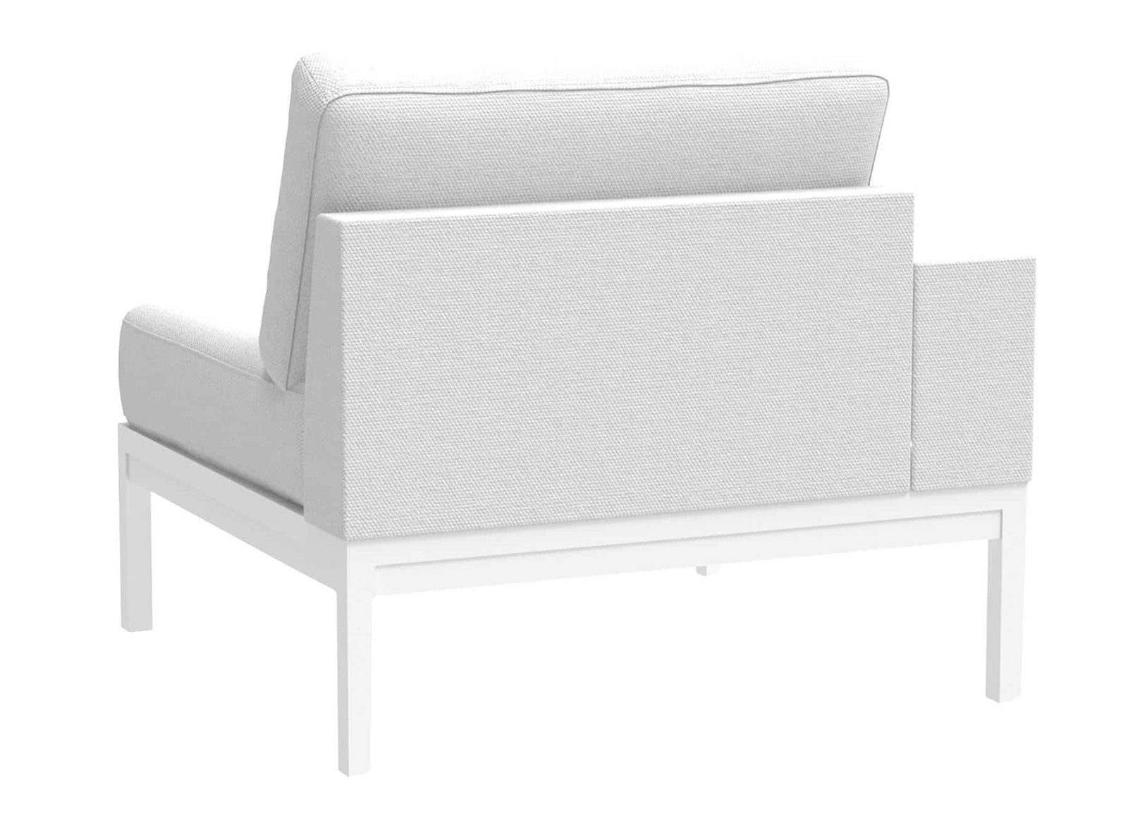 Product Description: Lane Venture 600-11 Bespoke Modular LF One Arm Chair - Crafted with a sleek, powder-coated aluminum plinth base, the Bespoke Modular collection achieves a floating, architectural appearance. The low-profile arms and structured frame contribute to a refined aesthetic, while the open leg design maintains visual lightness, making it ideal for both indoor and covered outdoor settings.