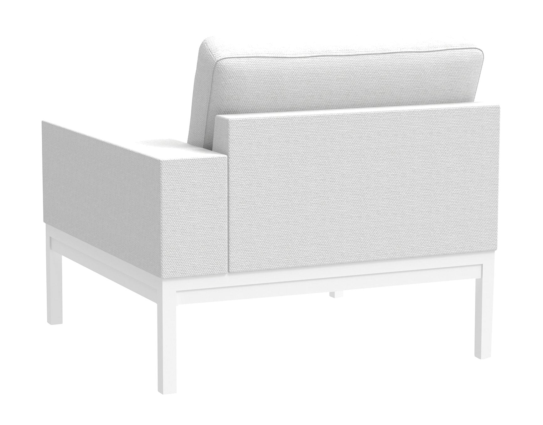 Product Description: Lane Venture 600-12 Bespoke Modular RF One Arm Chair - Crafted with a sleek, powder-coated aluminum plinth base, the Bespoke Modular collection achieves a floating, architectural appearance. The low-profile arms and structured frame contribute to a refined aesthetic, while the open leg design maintains visual lightness, making it ideal for both indoor and covered outdoor settings.