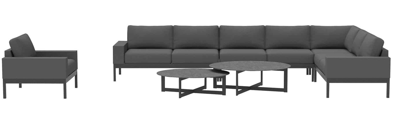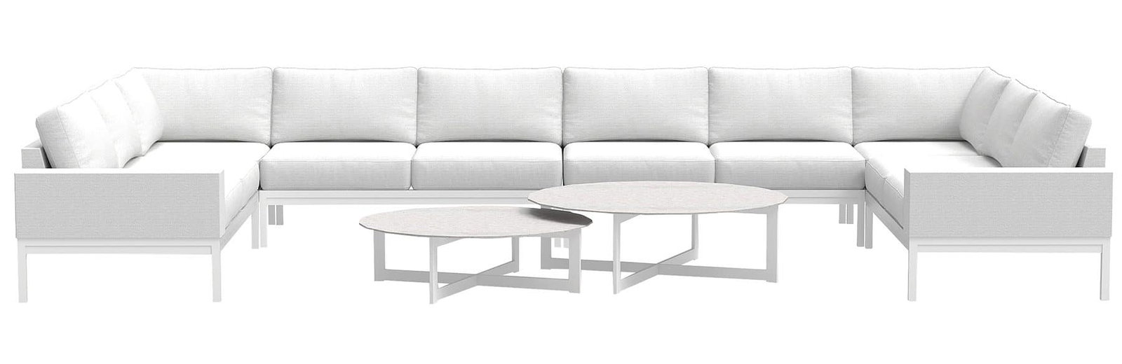 Whether you’re creating a bespoke residential terrace or a commercial hospitality setting, this collection brings a fresh design language to luxury outdoor living. Crafted with a sleek, powder-coated aluminum plinth base, the Bespoke Modular collection achieves a floating, architectural appearance. The low-profile arms and structured frame contribute to a refined aesthetic, while the open leg design maintains visual lightness, making it ideal for both indoor and covered outdoor settings.
