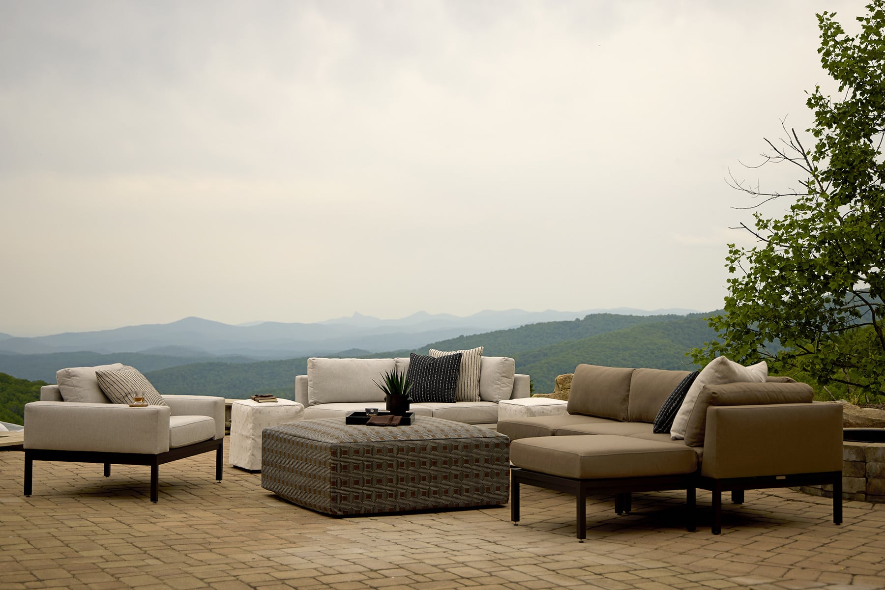 Whether you’re creating a bespoke residential terrace or a commercial hospitality setting, this collection brings a fresh design language to luxury outdoor living. Crafted with a sleek, powder-coated aluminum plinth base, the Bespoke Modular collection achieves a floating, architectural appearance. The low-profile arms and structured frame contribute to a refined aesthetic, while the open leg design maintains visual lightness, making it ideal for both indoor and covered outdoor settings.