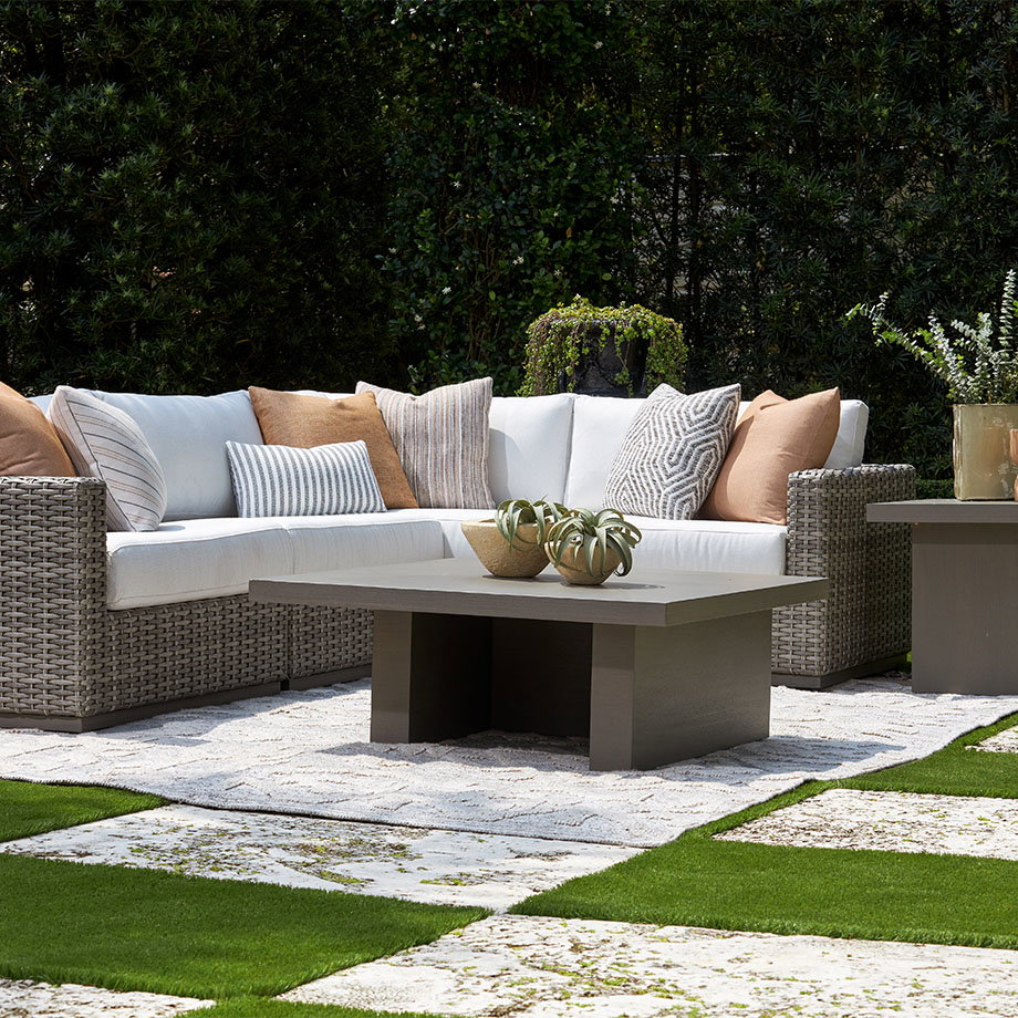 Experience the contemporary simplicity of the Hyannis collection. Seating and modular pieces exude modern sophistication with their clean, modern shape, plinth base, and wide-rounded weave in Nantucket Fog. The occasional tables, crafted from durable Resysta in Shale, are designed to replicate the wood look.
