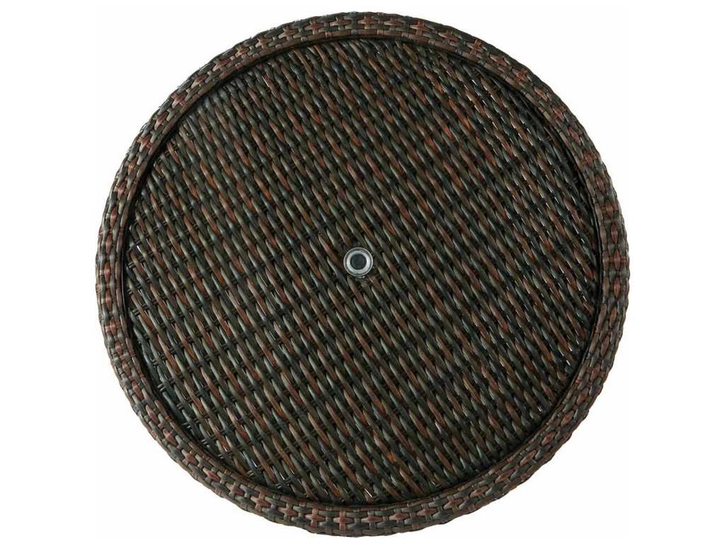 Product Description: Lane Venture 9790-50 South Hampton 48 inch Round Dining Table Woven Top with Glass - Tables feature a woven pedestal base with inset tempered glass tops. Select from two finishes; Tuscan Brown or Sandalwood, to create an outdoor room uniquely your own. FRAME: Weather-resistant, high UV polyethylene synthetic fiber, hand-woven over premium aluminum frame. FEATURES: Transitional design with a modern classic large scale weave. Pedestal base with woven top with inset clear, tempered glass tops. 1.625" Umbrella hole. Built-in umbrella base. Seats 4. FINISH: #471 Tuscan Brown or #463 Sandalwood.