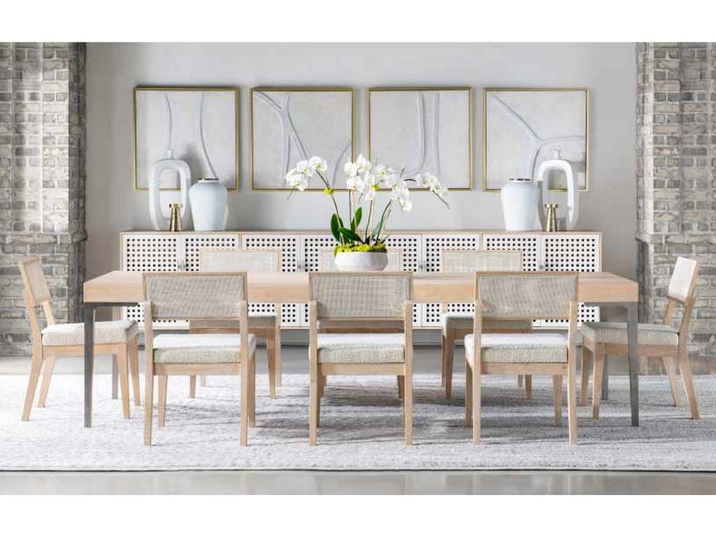Collection Description: Capture a modern resort feeling with the Biscayne Collection by Legacy Classic Modern. A light and airy blonde Malabar finish is paired with faux woven raffia Alabaster doors and drawer fronts these mixed materials create a serene and stylish setting. Crafted of Quartered Oak Veneers and Hardwoods, the collection offers a clean, fresh aesthetic expressed through organic elements and surface dimension. Design details include pierced and basket weave fronts on cabinets, Travertine Marble insets, matte nickel metal accents and tapered legs, geometric motifs and matte nickel hardware. The 30-piece collection features bedroom, dining, accents, occasional, home office and home entertainment furniture. A signature poster bed has a stunning matte nickel metal canopy that attaches to the upholstered headboard, which has touch lighting at the top for an inviting ambience.