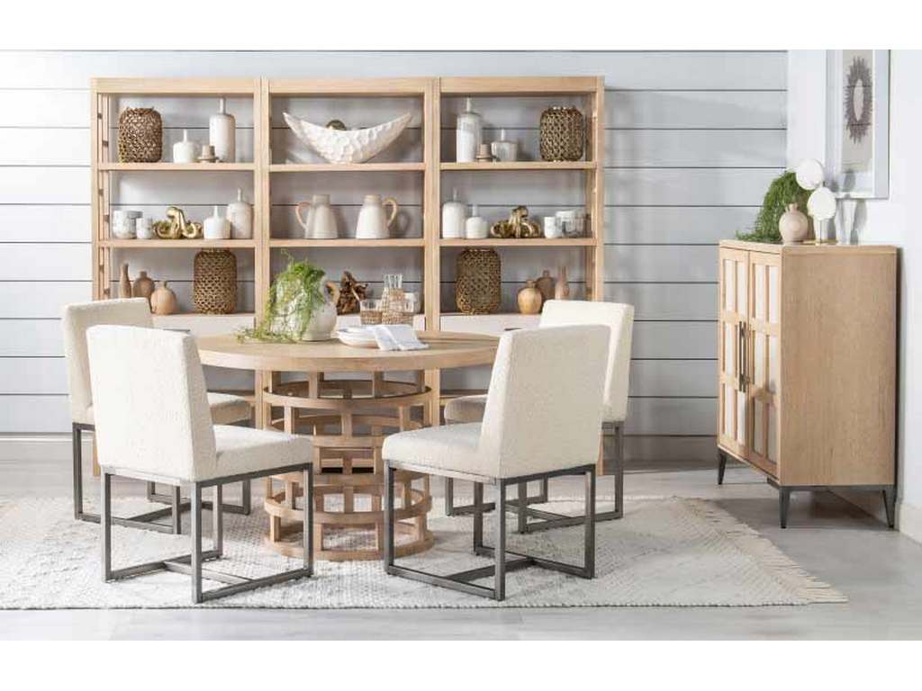 Capture a modern resort feeling with the Biscayne Collection by Legacy Classic Modern. A light and airy blonde Malabar finish is paired with faux woven raffia Alabaster doors and drawer fronts these mixed materials create a serene and stylish setting. Crafted of Quartered Oak Veneers and Hardwoods, the collection offers a clean, fresh aesthetic expressed through organic elements and surface dimension. Design details include pierced and basket weave fronts on cabinets, Travertine Marble insets, matte nickel metal accents and tapered legs, geometric motifs and matte nickel hardware. The 30-piece collection features bedroom, dining, accents, occasional, home office and home entertainment furniture. A signature poster bed has a stunning matte nickel metal canopy that attaches to the upholstered headboard, which has touch lighting at the top for an inviting ambience.